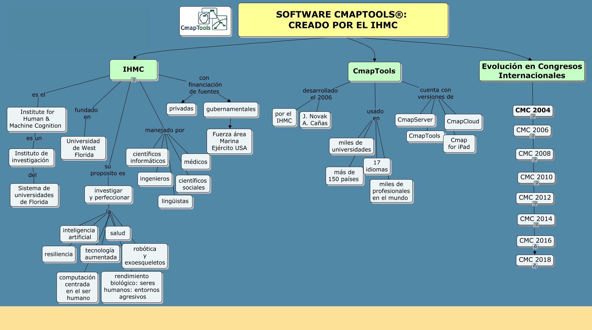 Este Cmap, tiene información relacionada con: Software CmapTools - Versión 2, investigar y perfeccionar la computación centrada en el ser humano, Institute for Human & Machine Cognition es un Instituto de investigación, investigar y perfeccionar la inteligencia artificial, CmapTools cuenta con versiones de CmapCloud, CmapTools cuenta con versiones de CmapTools, CmapTools usado en miles de profesionales en el mundo, CmapTools desarrollado el 2006 por el IHMC, CmapTools usado en miles de universidades, IHMC manejado por médicos, IHMC fundado en Universidad de West Florida, SOFTWARE CMAPTOOLS®: CREADO POR EL IHMC CmapTools, investigar y perfeccionar la tecnología aumentada, IHMC es el Institute for Human & Machine Cognition, Evolución en Congresos Internacionales CMC 2018, IHMC manejado por lingüistas, IHMC manejado por ingenieros, gubernamentales Fuerza área Marina Ejército USA, SOFTWARE CMAPTOOLS®: CREADO POR EL IHMC IHMC, investigar y perfeccionar la robótica y exoesqueletos, IHMC manejado por científicos sociales