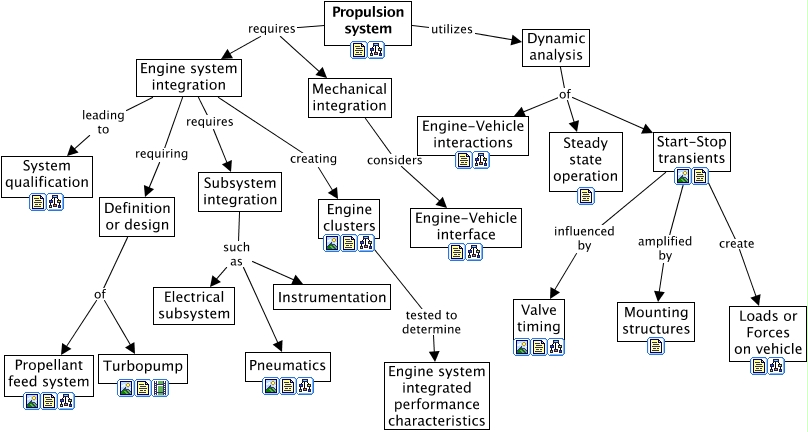 This Concept Map, created with IHMC CmapTools, has information related to: Propulsion system, Engine clusters tested to determine Engine system integrated performance characteristics, Start-Stop transients influenced by Valve timing, Engine system integration leading to System qualification, Mechanical integration considers Engine-Vehicle interface, Propulsion system utilizes Dynamic analysis, Dynamic analysis of Engine-Vehicle interactions, Engine system integration creating Engine clusters, Dynamic analysis of Steady state operation, Engine system integration requires Subsystem integration, Start-Stop transients create Loads or Forces on vehicle, Engine system integration requiring Definition or design, Subsystem integration such as Instrumentation, Propulsion system requires Engine system integration, Subsystem integration such as Pneumatics, Definition or design of Turbopump, Propulsion system requires Mechanical integration, Subsystem integration such as Electrical subsystem, Start-Stop transients amplified by Mounting structures, Definition or design of Propellant feed system, Dynamic analysis of Start-Stop transients