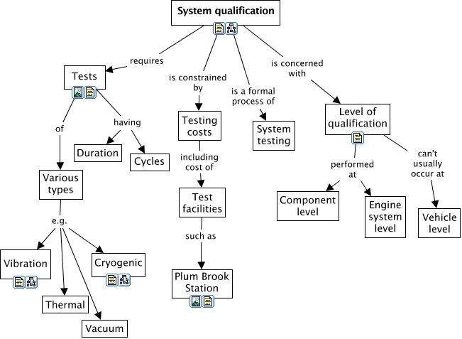 This Concept Map, created with IHMC CmapTools, has information related to: System qualification, Test facilities such as Plum Brook Station, System qualification is a formal process of System testing, System qualification is constrained by Testing costs, Level of qualification can't usually occur at Vehicle level, Tests having Cycles, Various types e.g. Vacuum, Level of qualification performed at Component level, Various types e.g. Thermal, Various types e.g. Vibration, Various types e.g. Cryogenic, Tests having Duration, Testing costs including cost of Test facilities, Level of qualification performed at Engine system level, System qualification requires Tests, System qualification is concerned with Level of qualification, Tests of Various types