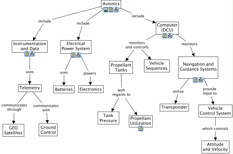 This Concept Map, created with IHMC CmapTools, has information related to: Avionics, Propellant Tanks with regards to Tank Pressure, Vehicle Control System which controls Attitude and Velocity, Avionics include Instrumentation and Data, Computer (DCU) monitors and controlls Propellant Tanks, Electrical Power System powers Electronics, Electrical Power System uses Batteries, Avionics include Computer (DCU), Computer (DCU) monitors Navigation and Guidance Systems, Navigation and Guidance Systems utilize Transponder, Navigation and Guidance Systems provide input to Vehicle Control System, Propellant Tanks with regards to Propellant Utilization, Telemetry communicates with Ground Control, Instrumentation and Data uses Telemetry, Avionics include Electrical Power System, Computer (DCU) monitors and controlls Vehicle Sequences, Telemetry communicates through GEO Satellites