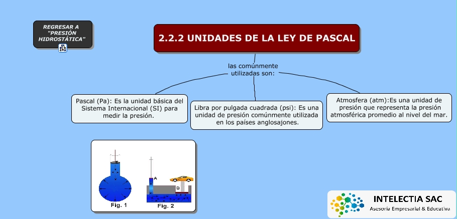 Este Cmap, tiene información relacionada con: 2.2.2 Unidades de la Ley de Pascal, 2.2.2 UNIDADES DE LA LEY DE PASCAL las comúnmente utilizadas son: Libra por pulgada cuadrada (psi): Es una unidad de presión comúnmente utilizada en los países anglosajones., 2.2.2 UNIDADES DE LA LEY DE PASCAL las comúnmente utilizadas son: Pascal (Pa): Es la unidad básica del Sistema Internacional (SI) para medir la presión., 2.2.2 UNIDADES DE LA LEY DE PASCAL las comúnmente utilizadas son: Atmosfera (atm):Es una unidad de presión que representa la presión atmosférica promedio al nivel del mar.