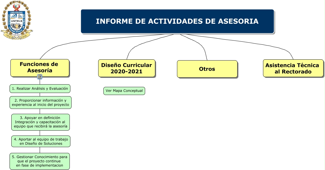 Este Cmap, tiene información relacionada con: ACTIVIDADES Y LOGROS UNTELS 2020-2023, INFORME DE ACTIVIDADES DE ASESORIA Asistencia Técnica al Rectorado, INFORME DE ACTIVIDADES DE ASESORIA Otros, INFORME DE ACTIVIDADES DE ASESORIA Diseño Curricular 2020-2021, INFORME DE ACTIVIDADES DE ASESORIA Funciones de Asesoría, Funciones de Asesoría 5. Gestionar Conocimiento para que el proyecto continue en fase de implementacion
