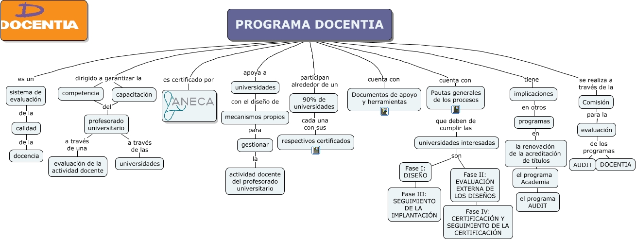Este Cmap, tiene información relacionada con: PROGRAMA DOCENTIA, capacitación del profesorado universitario, programas en la renovación de la acreditación de títulos, PROGRAMA DOCENTIA cuenta con Pautas generales de los procesos, Fase I: DISEÑO Fase III: SEGUIMIENTO DE LA IMPLANTACIÓN, PROGRAMA DOCENTIA dirigido a garantizar la competencia, PROGRAMA DOCENTIA es certificado por, universidades interesadas son Fase II: EVALUACIÓN EXTERNA DE LOS DISEÑOS, PROGRAMA DOCENTIA cuenta con Documentos de apoyo y herramientas, evaluación de los programas AUDIT, sistema de evaluación de la calidad, profesorado universitario a través de una evaluación de la actividad docente, la renovación de la acreditación de títulos el programa AUDIT, PROGRAMA DOCENTIA participan alrededor de un 90% de universidades, mecanismos propios para gestionar, PROGRAMA DOCENTIA tiene implicaciones, evaluación de los programas DOCENTIA, competencia del profesorado universitario, 90% de universidades cada una con sus respectivos certificados, Pautas generales de los procesos que deben de cumplir las universidades interesadas, PROGRAMA DOCENTIA dirigido a garantizar la capacitación
