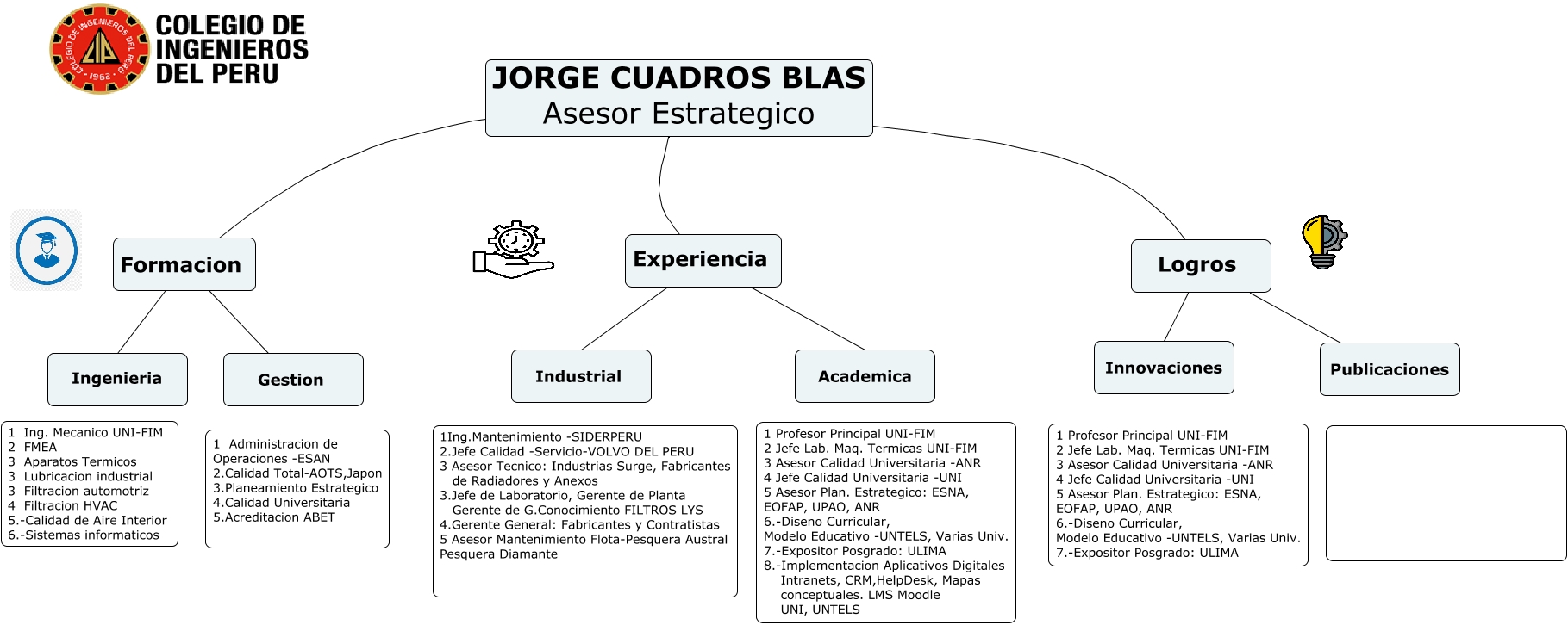 Este Cmap, tiene información relacionada con: JORGE CUADROS BLAS -ASESOR, Experiencia Academica, JORGE CUADROS BLAS Asesor Estrategico Logros, JORGE CUADROS BLAS Asesor Estrategico Formacion, JORGE CUADROS BLAS Asesor Estrategico Experiencia, Formacion Gestion, Formacion Ingenieria, Logros Innovaciones, Logros Publicaciones, Experiencia Industrial