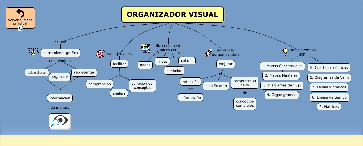 Este Cmap, tiene información relacionada con: ORGANIZADOR VISUAL, facilitar la análisis, retención de información, facilitar la comprensión, ORGANIZADOR VISUAL utilizan elementos gráficos como colores, mejorar la planificación, mejorar la presentación visual, herramienta gráfica que ayuda a representar, ORGANIZADOR VISUAL unos ejemplos son: 5. Cuadros sinópticos, facilitar la conexión de conceptos, 1. Mapas Conceptuales 4. Organigramas, mejorar la retención, 5. Cuadros sinópticos 9. Matrices, ORGANIZADOR VISUAL unos ejemplos son: 1. Mapas Conceptuales, herramienta gráfica que ayuda a estructurar, ORGANIZADOR VISUAL es una herramienta gráfica, presentación visual de conceptos complejos, herramienta gráfica que ayuda a organizar, estructurar la información, ORGANIZADOR VISUAL utilizan elementos gráficos como nodos, información de manera