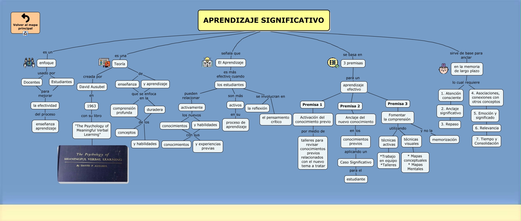 Este Cmap, tiene información relacionada con: APRENDIZAJE SIGNIFICATIVO PARA COLEGIOS, duradera de los conceptos, aprendizaje efectivo Premisa 3, Caso Significativo para el estudiante, Teoría de y aprendizaje, los estudiantes pueden relacionar activamente, y habilidades con sus y experiencias previas, enfoque usado por Docentes, Premisa 1 Activación del conocimiento previo, Fomentar la comprensión utilizando técnicas visuales, Fomentar la comprensión y no la memorización, conocimientos con sus y experiencias previas, Premisa 2 Anclaje del nuevo conocimiento, en la memoria de largo plazo lo cual requiere 4. Asociaciones, conexiones con otros conceptos, Activación del conocimiento previo por medio de talleres para revisar conocimientos previos relacionados con el nuevo tema a tratar, 3 premisas para un aprendizaje efectivo, y aprendizaje que se enfoca en la duradera, los estudiantes se involucran en la reflexión, comprensión profunda de los conceptos, David Ausubel en 1963, 1. Atención consciente 3. Repaso