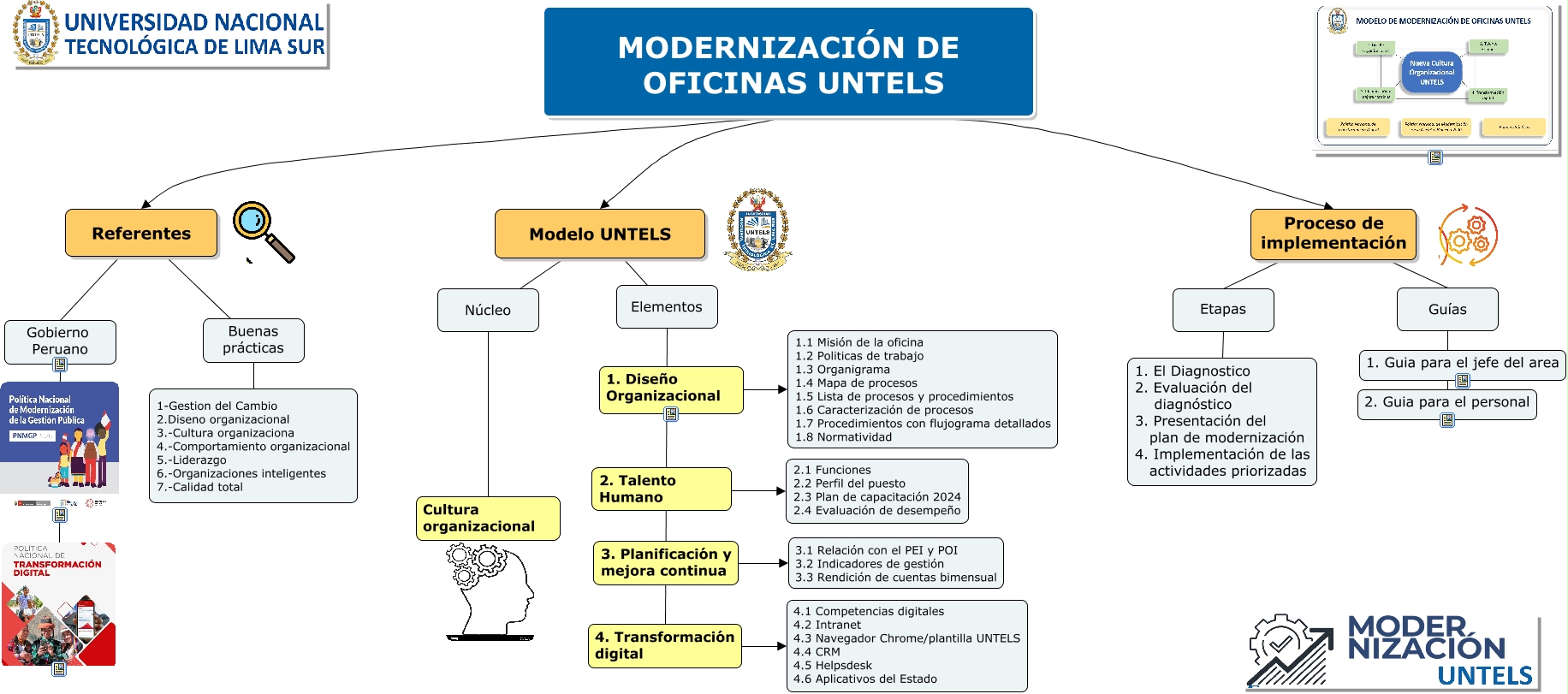 Este Cmap, tiene información relacionada con: MODERNIZACIÓN DE OFICINAS UNTELS, Modelo UNTELS Núcleo, MODERNIZACIÓN DE OFICINAS UNTELS Referentes, 2. Talento Humano 2.1 Funciones 2.2 Perfil del puesto 2.3 Plan de capacitación 2024 2.4 Evaluación de desempeño, 4. Transformación digital 4.1 Competencias digitales 4.2 Intranet 4.3 Navegador Chrome/plantilla UNTELS 4.4 CRM 4.5 Helpsdesk 4.6 Aplicativos del Estado, Modelo UNTELS Elementos, MODERNIZACIÓN DE OFICINAS UNTELS Proceso de implementación, MODERNIZACIÓN DE OFICINAS UNTELS Modelo UNTELS, 3. Planificación y mejora continua 3.1 Relación con el PEI y POI 3.2 Indicadores de gestión 3.3 Rendición de cuentas bimensual, Etapas 1. El Diagnostico 2. Evaluación del diagnóstico 3. Presentación del plan de modernización 4. Implementación de las actividades priorizadas, Proceso de implementación Etapas, Proceso de implementación Guías, Elementos 4. Transformación digital, Núcleo Cultura organizacional, Buenas prácticas 1-Gestion del Cambio 2.Diseno organizacional 3.-Cultura organizaciona 4.-Comportamiento organizacional 5.-Liderazgo 6.-Organizaciones inteligentes 7.-Calidad total, Gobierno Peruano, Referentes Gobierno Peruano, Referentes Buenas prácticas, Guías 2. Guia para el personal, 1. Diseño Organizacional 1.1 Misión de la oficina 1.2 Politicas de trabajo 1.3 Organigrama 1.4 Mapa de procesos 1.5 Lista de procesos y procedimientos 1.6 Caracterización de procesos 1.7 Procedimientos con flujograma detallados 1.8 Normatividad