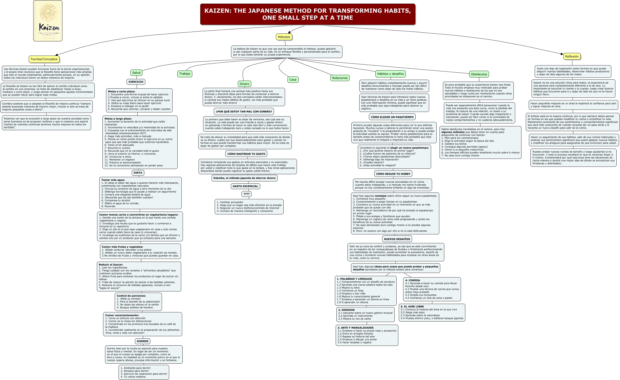 Este Cmap, tiene información relacionada con: KAIZEN THE JAPANESE METHOD FOR TRANSFORMING HABITS, ONE SMALL STEP AT A TIME, KAIZEN: THE JAPANESE METHOD FOR TRANSFORMING HABITS, ONE SMALL STEP AT A TIME Teorías/Conceptos, La belleza de Kaizen es que una vez que ha comprendido el método, puede aplicarlo a casi cualquier parte de su vida. Es un enfoque flexible y personalizado para el cambio, por lo que todos tendrán su propia experiencia. Hábitos y desafíos, Salud 1. Ambiente para dormir 2. Rituales para dormir 3. Ejercicio de respiración para dormir 4. Tu rutina mañana, Hábitos y desafíos Aquí hay algunas ideas para cosas que puede probar y pequeños desafíos aprobados por el método kaizen para comenzar:, Obstáculos Habrá obstáculos inevitables en el camino, pero hay algunos métodos que debes tener en cuenta para asegurarte de continuar con Kaizen: 1. Plan para los contratiempos 2. Elige la actividad según la época del año. 3. Celebra tus éxitos 4. Consigue algunas porristas (apoyo) 5. Volver a lo pequeño (reducirlos) 6. Los tiempos difíciles pueden enseñarte mucho sobre ti mismo 7. No seas duro contigo mismo, La belleza de Kaizen es que una vez que ha comprendido el método, puede aplicarlo a casi cualquier parte de su vida. Es un enfoque flexible y personalizado para el cambio, por lo que todos tendrán su propia experiencia. Casa, La belleza de Kaizen es que una vez que ha comprendido el método, puede aplicarlo a casi cualquier parte de su vida. Es un enfoque flexible y personalizado para el cambio, por lo que todos tendrán su propia experiencia. Relaciones, 1. PALABRAS Y LENGUAJE 1.1 Comprometerse con un desafío de escritura 1.2 Aprenda una nueva palabra todos los días 1.3 Mejora tu letra 1.4 Comienza un blog 1.5 Empiece a leer más 1.6 Mejora tu conocimiento general 1.7 Empiece a aprender un idioma en línea 1.8 O aprender un idioma 3. ARTE Y MANUALIDADES 3.1 Empiece a hacer su propia ropa y accesorios 3.2 Entra en arreglos florales 3.3 Repase su historia del arte 3.4 Empiece a dibujar y/o pintar 3.5 Hacer tarjetas y regalos, Dinero 1. Cambiar proveedor 2. Haga que su hogar sea más eficiente en la energía 3. Negociar un nuevo teléfono/contrato de Internet 4. Compre de manera inteligente y consciente, La belleza de Kaizen es que una vez que ha comprendido el método, puede aplicarlo a casi cualquier parte de su vida. Es un enfoque flexible y personalizado para el cambio, por lo que todos tendrán su propia experiencia. Dinero, 4. COMIDA 4.1 Aprenda a hacer su comida para llevar favorita desde cero 4.2 Pruebe una técnica de cocina que nunca antes haya probado 4.3 Amplía tus horizontes 4.4 Comience un club de cena o pastel 5. EL AIRE LIBRE 5.1 Conozca la historia del área en la que vive 5.2 Salga más lejos 5.3 Aprenda sobre la naturaleza 5.4 Prueba shinrin-yoku, o bañarse bosque japonés, Teorías/Conceptos Podemos ver que la evolución a largo plazo de nuestra sociedad como seres humanos es de progreso continuo y que si creamos una espiral [racha] de victorias continuas seremos mucho mejores en todos los sentidos”., La belleza de Kaizen es que una vez que ha comprendido el método, puede aplicarlo a casi cualquier parte de su vida. Es un enfoque flexible y personalizado para el cambio, por lo que todos tendrán su propia experiencia. Obstáculos, Métodos La belleza de Kaizen es que una vez que ha comprendido el método, puede aplicarlo a casi cualquier parte de su vida. Es un enfoque flexible y personalizado para el cambio, por lo que todos tendrán su propia experiencia., La belleza de Kaizen es que una vez que ha comprendido el método, puede aplicarlo a casi cualquier parte de su vida. Es un enfoque flexible y personalizado para el cambio, por lo que todos tendrán su propia experiencia. Salud, KAIZEN: THE JAPANESE METHOD FOR TRANSFORMING HABITS, ONE SMALL STEP AT A TIME Reflexión, Reflexión Puedes probar nuevas rutinas de tamaño y luego ajustarlas si no funcionan. Y todo el proceso resultará en que te conozcas mejor a ti mismo; Comprenderá por qué reacciona ante las situaciones de cierta manera y tendrá una mejor idea de dónde se encuentran sus fortalezas y debilidades., La belleza de Kaizen es que una vez que ha comprendido el método, puede aplicarlo a casi cualquier parte de su vida. Es un enfoque flexible y personalizado para el cambio, por lo que todos tendrán su propia experiencia. Trabajo, Aquí hay algunas ideas para cosas que puede probar y pequeños desafíos aprobados por el método kaizen para comenzar: 1. PALABRAS Y LENGUAJE 1.1 Comprometerse con un desafío de escritura 1.2 Aprenda una nueva palabra todos los días 1.3 Mejora tu letra 1.4 Comienza un blog 1.5 Empiece a leer más 1.6 Mejora tu conocimiento general 1.7 Empiece a aprender un idioma en línea 1.8 O aprender un idioma, Aquí hay algunas ideas para cosas que puede probar y pequeños desafíos aprobados por el método kaizen para comenzar: 4. COMIDA 4.1 Aprenda a hacer su comida para llevar favorita desde cero 4.2 Pruebe una técnica de cocina que nunca antes haya probado 4.3 Amplía tus horizontes 4.4 Comience un club de cena o pastel