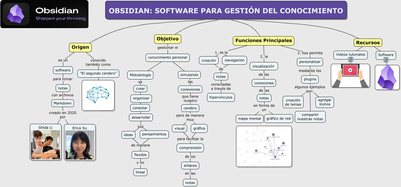 Este Cmap, tiene información relacionada con: OBSIDIAN, notas en forma de un gráfico de red, OBSIDIAN: SOFTWARE PARA GESTIÓN DEL CONOCIMIENTO Funciones Principales, conocimiento personal Metodología, Markdown creado en 2020 por Erica Xu, Funciones Principales 1. es la creación, Origen es un software, cerebro pero de manera muy visual, software para tomar notas, Metodología es crear, Recursos Videos tutoriales, "El segundo cerebro", personalizar mediante los plugins, visualización de las conexiones, creación de notas, visual para facilitar la comprensión, pensamientos de manera flexible, comprensión de los enlaces, plugins algunos ejemplos son: compartir nuestras notas, conocimiento personal simulando, Origen conocido también como "El segundo cerebro"