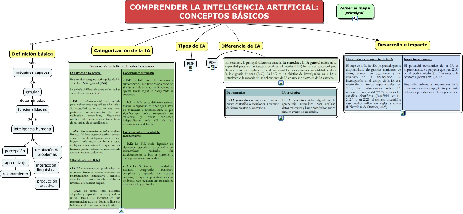Este Cmap, tiene información relacionada con: COMPRENDER LA INTELIGENCIA ARTIFICIAL - CONCEPTOS BÁSICOS, COMPRENDER LA INTELIGENCIA ARTIFICIAL: CONCEPTOS BÁSICOS Diferencia de IA, inteligencia humana como resolución de problemas, Diferencia de IA PDF, COMPRENDER LA INTELIGENCIA ARTIFICIAL: CONCEPTOS BÁSICOS su Definición básica, Diferencia de IA,, Categorización de la IA, percepción razonamiento, Definición básica son máquinas capaces, inteligencia humana como percepción, resolución de problemas producción creativa, COMPRENDER LA INTELIGENCIA ARTIFICIAL: CONCEPTOS BÁSICOS Desarrollo e impacto, COMPRENDER LA INTELIGENCIA ARTIFICIAL: CONCEPTOS BÁSICOS Categorización de la IA, Desarrollo e impacto, emular determinadas funcionalidades, máquinas capaces de emular, funcionalidades de la inteligencia humana, Tipos de IA PDF, COMPRENDER LA INTELIGENCIA ARTIFICIAL: CONCEPTOS BÁSICOS Tipos de IA