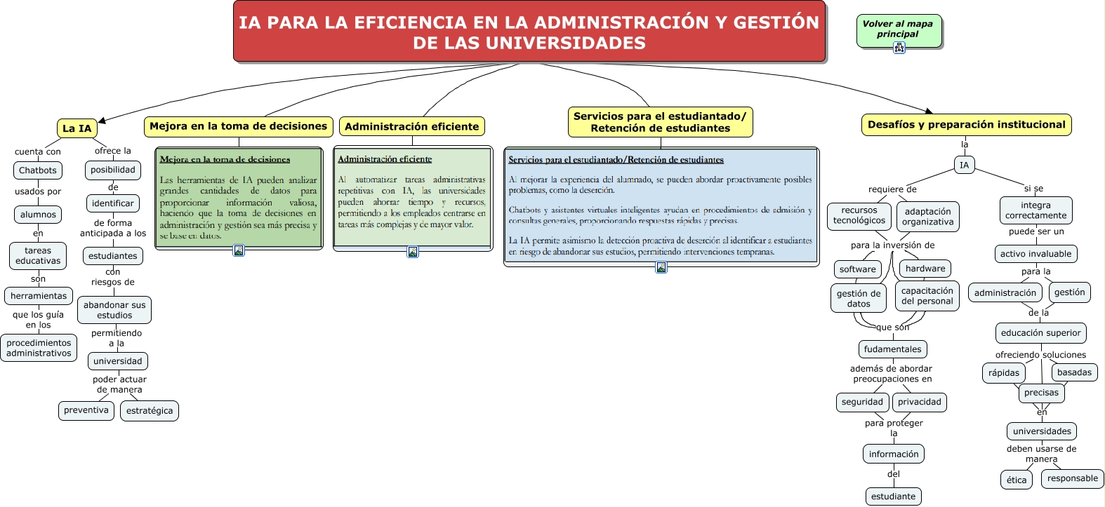 Este Cmap, tiene información relacionada con: IA PARA LA EFICIENCIA EN LA ADMINISTRACIÓN Y GESTIÓN DE LAS UNIVERSIDADES, educación superior ofreciendo soluciones rápidas, La IA cuenta con Chatbots, educación superior ofreciendo soluciones precisas, recursos tecnológicos para la inversión de software, recursos tecnológicos para la inversión de capacitación del personal, Chatbots usados por alumnos, hardware que son fudamentales, universidades deben usarse de manera responsable, administración de la educación superior, IA PARA LA EFICIENCIA EN LA ADMINISTRACIÓN Y GESTIÓN DE LAS UNIVERSIDADES Desafíos y preparación institucional, alumnos en tareas educativas, universidades deben usarse de manera ética, privacidad para proteger la información, IA PARA LA EFICIENCIA EN LA ADMINISTRACIÓN Y GESTIÓN DE LAS UNIVERSIDADES Servicios para el estudiantado/ Retención de estudiantes, adaptación organizativa para la inversión de software, fudamentales además de abordar preocupaciones en seguridad, rápidas en universidades, recursos tecnológicos para la inversión de hardware, Mejora en la toma de decisiones, recursos tecnológicos para la inversión de gestión de datos
