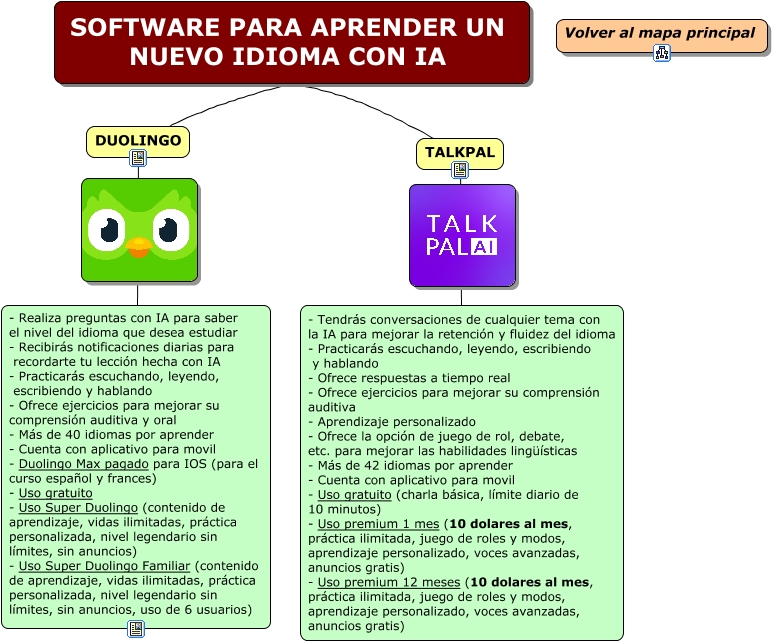 Este Cmap, tiene información relacionada con: SOFTWARE PARA APRENDER UN NUEVO IDIOMA CON IA, SOFTWARE PARA APRENDER UN NUEVO IDIOMA CON IA DUOLINGO, TALKPAL - Tendrás conversaciones de cualquier tema con la IA para mejorar la retención y fluidez del idioma - Practicarás escuchando, leyendo, escribiendo y hablando - Ofrece respuestas a tiempo real - Ofrece ejercicios para mejorar su comprensión auditiva - Aprendizaje personalizado - Ofrece la opción de juego de rol, debate, etc. para mejorar las habilidades lingüísticas - Más de 42 idiomas por aprender - Cuenta con aplicativo para movil - Uso gratuito (charla básica, límite diario de 10 minutos) - Uso premium 1 mes (10 dolares al mes, práctica ilimitada, juego de roles y modos, aprendizaje personalizado, voces avanzadas, anuncios gratis) - Uso premium 12 meses (10 dolares al mes, práctica ilimitada, juego de roles y modos, aprendizaje personalizado, voces avanzadas, anuncios gratis), DUOLINGO - Realiza preguntas con IA para saber el nivel del idioma que desea estudiar - Recibirás notificaciones diarias para recordarte tu lección hecha con IA - Practicarás escuchando, leyendo, escribiendo y hablando - Ofrece ejercicios para mejorar su comprensión auditiva y oral - Más de 40 idiomas por aprender - Cuenta con aplicativo para movil - Duolingo Max pagado para IOS (para el curso español y frances) - Uso gratuito - Uso Super Duolingo (contenido de aprendizaje, vidas ilimitadas, práctica personalizada, nivel legendario sin límites, sin anuncios) - Uso Super Duolingo Familiar (contenido de aprendizaje, vidas ilimitadas, práctica personalizada, nivel legendario sin límites, sin anuncios, uso de 6 usuarios), SOFTWARE PARA APRENDER UN NUEVO IDIOMA CON IA TALKPAL