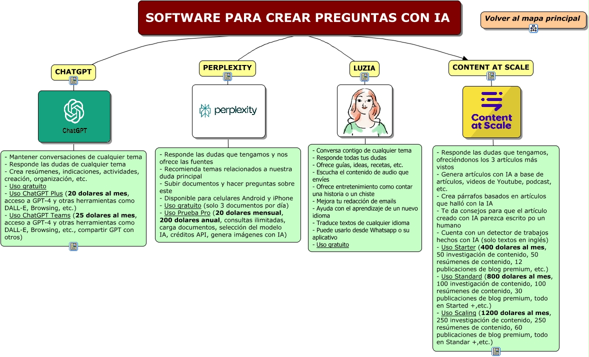 Este Cmap, tiene información relacionada con: SOFTWARE CON TÉCNICAS GPT, SOFTWARE PARA CREAR PREGUNTAS CON IA LUZIA, LUZIA - Conversa contigo de cualquier tema - Responde todas tus dudas - Ofrece guías, ideas, recetas, etc. - Escucha el contenido de audio que envíes - Ofrece entretenimiento como contar una historia o un chiste - Mejora tu redacción de emails - Ayuda con el aprendizaje de un nuevo idioma - Traduce textos de cualquier idioma - Puede usarlo desde Whatsapp o su aplicativo - Uso gratuito, PERPLEXITY - Responde las dudas que tengamos y nos ofrece las fuentes - Recomienda temas relacionados a nuestra duda principal - Subir documentos y hacer preguntas sobre este - Disponible para celulares Android y iPhone - Uso gratuito (solo 3 documentos por día) - Uso Prueba Pro (20 dolares mensual, 200 dolares anual, consultas ilimitadas, carga documentos, selección del modelo IA, créditos API, genera imágenes con IA), SOFTWARE PARA CREAR PREGUNTAS CON IA PERPLEXITY, SOFTWARE PARA CREAR PREGUNTAS CON IA CONTENT AT SCALE, SOFTWARE PARA CREAR PREGUNTAS CON IA CHATGPT, CONTENT AT SCALE - Responde las dudas que tengamos, ofreciéndonos los 3 artículos más vistos - Genera artículos con IA a base de artículos, videos de Youtube, podcast, etc. - Crea párrafos basados en artículos que halló con la IA - Te da consejos para que el artículo creado con IA parezca escrito po un humano - Cuenta con un detector de trabajos hechos con IA (solo textos en inglés) - Uso Starter (400 dolares al mes, 50 investigación de contenido, 50 resúmenes de contenido, 12 publicaciones de blog premium, etc.) - Uso Standard (800 dolares al mes, 100 investigación de contenido, 100 resúmenes de contenido, 30 publicaciones de blog premium, todo en Started +,etc.) - Uso Scaling (1200 dolares al mes, 250 investigación de contenido, 250 resúmenes de contenido, 60 publicaciones de blog premium, todo en Standar +,etc.), CHATGPT - Mantener conversaciones de cualquier tema - Responde las dudas de cualquier tema - Crea resúmenes, indicaciones, actividades, creación, organización, etc. - Uso gratuito - Uso ChatGPT Plus (20 dolares al mes, acceso a GPT-4 y otras herramientas como DALL-E, Browsing, etc.) - Uso ChatGPT Teams (25 dolares al mes, acceso a GPT-4 y otras herramientas como DALL-E, Browsing, etc., compartir GPT con otros)