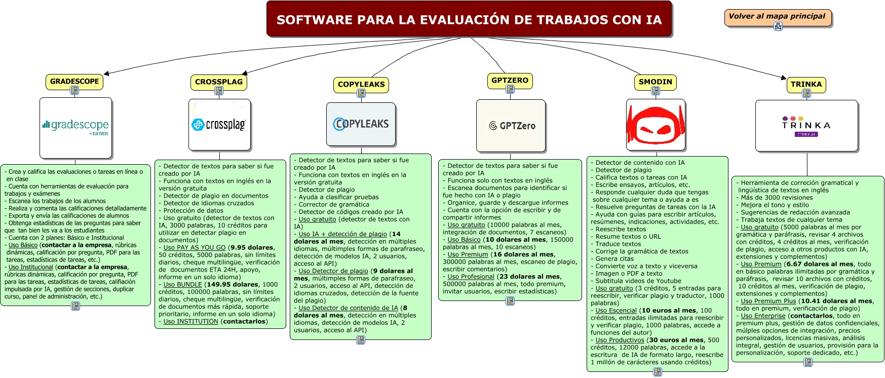 Este Cmap, tiene información relacionada con: SOFTWARE PARA LA EVALUACIÓN DE TRABAJOS CON IA, SOFTWARE PARA LA EVALUACIÓN DE TRABAJOS CON IA GRADESCOPE, SOFTWARE PARA LA EVALUACIÓN DE TRABAJOS CON IA TRINKA, CROSSPLAG - Detector de textos para saber si fue creado por IA - Funciona con textos en inglés en la versión gratuita - Detector de plagio en documentos - Detector de idiomas cruzados - Protección de datos - Uso gratuito (detector de textos con IA, 3000 palabras, 10 créditos para utilizar en detectar plagio en documentos) - Uso PAY AS YOU GO (9.95 dolares, 50 créditos, 5000 palabras, sin límites diarios, cheque multilingüe, verificación de documentos ETA 24H, apoyo, informe en un solo idioma) - Uso BUNDLE (149.95 dolares, 1000 créditos, 100000 palabras, sin límites diarios, cheque multilingüe, verificación de documentos más rápida, soporte prioritario, informe en un solo idioma) - Uso INSTITUTION (contactarlos), SOFTWARE PARA LA EVALUACIÓN DE TRABAJOS CON IA SMODIN, TRINKA - Herramienta de correción gramatical y lingüística de textos en inglés - Más de 3000 revisiones - Mejora el tono y estilo - Sugerencias de redacción avanzada - Trabaja textos de cualquier tema - Uso gratuito (5000 palabras al mes por gramática y paráfrasis, revisar 4 archivos con créditos, 4 créditos al mes, verificación de plagio, acceso a otros productos con IA, extensiones y complementos) - Uso Premium (6.67 dolares al mes, todo en básico palabras ilimitadas por gramática y paráfrasis, revisar 10 archivos con créditos, 10 créditos al mes, verificación de plagio, extensiones y complementos) - Uso Premium Plus (10.41 dolares al mes, todo en premium, verificación de plagio) - Uso Enterprise (contactarlos, todo en premium plus, gestión de datos confidenciales, múlples opciones de integración, precios personalizados, licencias masivas, análisis integral, gestión de usuarios, provisión para la personalización, soporte dedicado, etc.), SMODIN - Detector de contenido con IA - Detector de plagio - Califica textos o tareas con IA - Escribe ensayos, artículos, etc. - Responde cualquier duda que tengas sobre cualquier tema o ayuda a es - Resuelve preguntas de tareas con la IA - Ayuda con guías para escribir artículos, resúmenes, indicaciones, actividades, etc. - Reescribe textos - Resume textos o URL - Traduce textos - Corrige la gramática de textos - Genera citas - Convierte voz a texto y viceversa - Imagen o PDF a texto - Subtitula videos de Youtube - Uso gratuito (3 créditos, 5 entradas para reescribir, verificar plagio y traductor, 1000 palabras) - Uso Escencial (10 euros al mes, 100 créditos, entradas ilimitadas para reescribir y verificar plagio, 1000 palabras, accede a funciones del autor) - Uso Productivos (30 euros al mes, 500 créditos, 12000 palabras, accede a la escritura de IA de formato largo, reescribe 1 millón de carácteres usando créditos), SOFTWARE PARA LA EVALUACIÓN DE TRABAJOS CON IA GPTZERO, GRADESCOPE - Crea y califica las evaluaciones o tareas en línea o en clase - Cuenta con herramientas de evaluación para trabajos y exámenes - Escanea los trabajos de los alumnos - Realiza y comenta las calificaciones detalladamente - Exporta y envía las calificaciones de alumnos - Obtenga estadísticas de las preguntas para saber que tan bien les va a los estudiantes - Cuenta con 2 planes: Básico e Institucional - Uso Básico (contactar a la empresa, rúbricas dinámicas, calificación por pregunta, PDF para las tareas, estadísticas de tareas, etc.) - Uso Institucional (contactar a la empresa, rúbricas dinámicas, calificación por pregunta, PDF para las tareas, estadísticas de tareas, califiación impulsada por IA, gestión de secciones, duplicar curso, panel de administración, etc.), COPYLEAKS - Detector de textos para saber si fue creado por IA - Funciona con textos en inglés en la versión gratuita - Detector de plagio - Ayuda a clasificar pruebas - Corrector de gramática - Detector de códigos creado por IA - Uso gratuito (detector de textos con IA) - Uso IA + detección de plagio (14 dolares al mes, detección en múltiples idiomas, múltimples formas de parafraseo, detección de modelos IA, 2 usuarios, acceso al API) - Uso Detector de plagio (9 dolares al mes, múltimples formas de parafraseo, 2 usuarios, acceso al API, detección de idiomas cruzados, detección de la fuente del plagio) - Uso Detector de contenido de IA (8 dolares al mes, detección en múltiples idiomas, detección de modelos IA, 2 usuarios, acceso al API), GPTZERO - Detector de textos para saber si fue creado por IA - Funciona solo con textos en inglés - Escanea documentos para identificar si fue hecho con IA o plagio - Organice, guarde y descargue informes - Cuenta con la opción de escribir y de compartir informes - Uso gratuito (10000 palabras al mes, integración de documentos, 7 escaneos) - Uso Básico (10 dolares al mes, 150000 palabras al mes, 10 escaneos) - Uso Premium (16 dolares al mes, 300000 palabras al mes, escaneo de plagio, escribir comentarios) - Uso Profesional (23 dolares al mes, 500000 palabras al mes, todo premium, invitar usuarios, escribir estadísticas), SOFTWARE PARA LA EVALUACIÓN DE TRABAJOS CON IA COPYLEAKS, SOFTWARE PARA LA EVALUACIÓN DE TRABAJOS CON IA CROSSPLAG