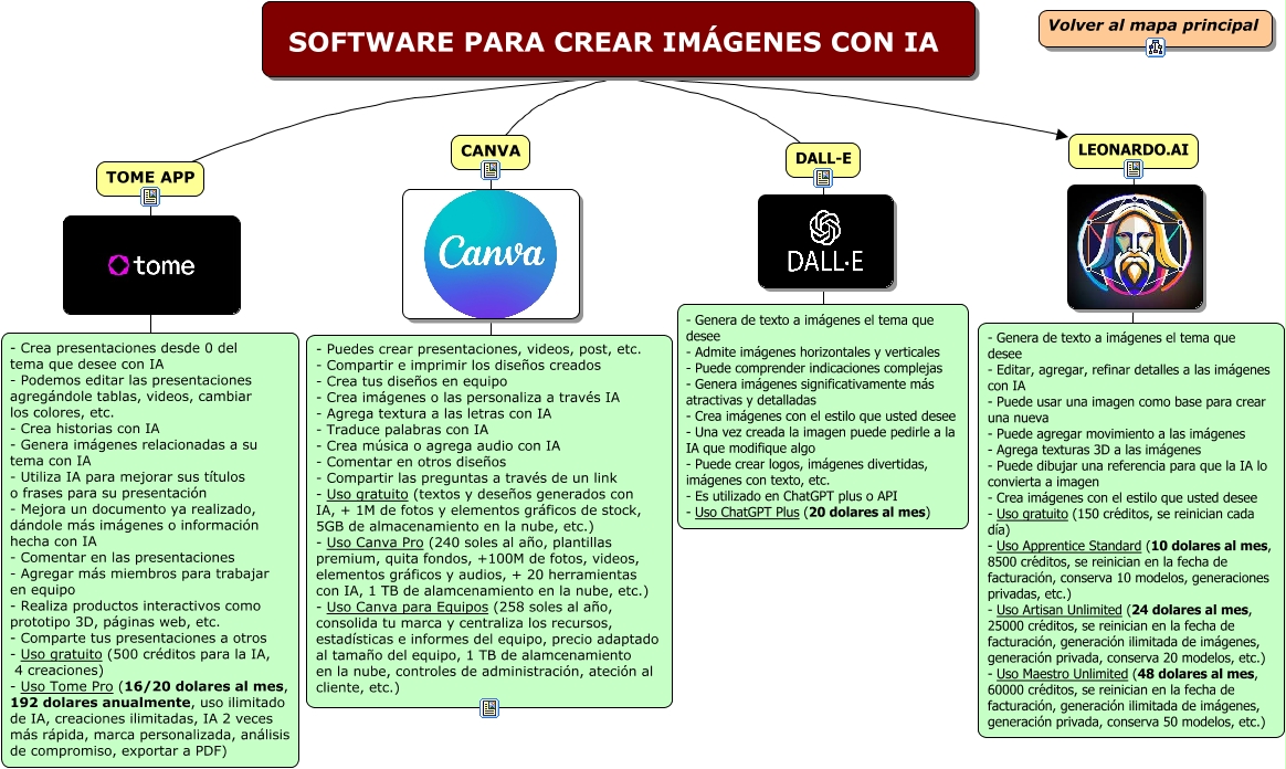 Este Cmap, tiene información relacionada con: SOFTWARE PARA CREAR IMÁGENES CON IA, TOME APP - Crea presentaciones desde 0 del tema que desee con IA - Podemos editar las presentaciones agregándole tablas, videos, cambiar los colores, etc. - Crea historias con IA - Genera imágenes relacionadas a su tema con IA - Utiliza IA para mejorar sus títulos o frases para su presentación - Mejora un documento ya realizado, dándole más imágenes o información hecha con IA - Comentar en las presentaciones - Agregar más miembros para trabajar en equipo - Realiza productos interactivos como prototipo 3D, páginas web, etc. - Comparte tus presentaciones a otros - Uso gratuito (500 créditos para la IA, 4 creaciones) - Uso Tome Pro (16/20 dolares al mes, 192 dolares anualmente, uso ilimitado de IA, creaciones ilimitadas, IA 2 veces más rápida, marca personalizada, análisis de compromiso, exportar a PDF), SOFTWARE PARA CREAR IMÁGENES CON IA DALL-E, DALL-E - Genera de texto a imágenes el tema que desee - Admite imágenes horizontales y verticales - Puede comprender indicaciones complejas - Genera imágenes significativamente más atractivas y detalladas - Crea imágenes con el estilo que usted desee - Una vez creada la imagen puede pedirle a la IA que modifique algo - Puede crear logos, imágenes divertidas, imágenes con texto, etc. - Es utilizado en ChatGPT plus o API - Uso ChatGPT Plus (20 dolares al mes), SOFTWARE PARA CREAR IMÁGENES CON IA LEONARDO.AI, SOFTWARE PARA CREAR IMÁGENES CON IA TOME APP, SOFTWARE PARA CREAR IMÁGENES CON IA CANVA, LEONARDO.AI - Genera de texto a imágenes el tema que desee - Editar, agregar, refinar detalles a las imágenes con IA - Puede usar una imagen como base para crear una nueva - Puede agregar movimiento a las imágenes - Agrega texturas 3D a las imágenes - Puede dibujar una referencia para que la IA lo convierta a imagen - Crea imágenes con el estilo que usted desee - Uso gratuito (150 créditos, se reinician cada día) - Uso Apprentice Standard (10 dolares al mes, 8500 créditos, se reinician en la fecha de facturación, conserva 10 modelos, generaciones privadas, etc.) - Uso Artisan Unlimited (24 dolares al mes, 25000 créditos, se reinician en la fecha de facturación, generación ilimitada de imágenes, generación privada, conserva 20 modelos, etc.) - Uso Maestro Unlimited (48 dolares al mes, 60000 créditos, se reinician en la fecha de facturación, generación ilimitada de imágenes, generación privada, conserva 50 modelos, etc.), CANVA - Puedes crear presentaciones, videos, post, etc. - Compartir e imprimir los diseños creados - Crea tus diseños en equipo - Crea imágenes o las personaliza a través IA - Agrega textura a las letras con IA - Traduce palabras con IA - Crea música o agrega audio con IA - Comentar en otros diseños - Compartir las preguntas a través de un link - Uso gratuito (textos y deseños generados con IA, + 1M de fotos y elementos gráficos de stock, 5GB de almacenamiento en la nube, etc.) - Uso Canva Pro (240 soles al año, plantillas premium, quita fondos, +100M de fotos, videos, elementos gráficos y audios, + 20 herramientas con IA, 1 TB de alamcenamiento en la nube, etc.) - Uso Canva para Equipos (258 soles al año, consolida tu marca y centraliza los recursos, estadísticas e informes del equipo, precio adaptado al tamaño del equipo, 1 TB de alamcenamiento en la nube, controles de administración, ateción al cliente, etc.)