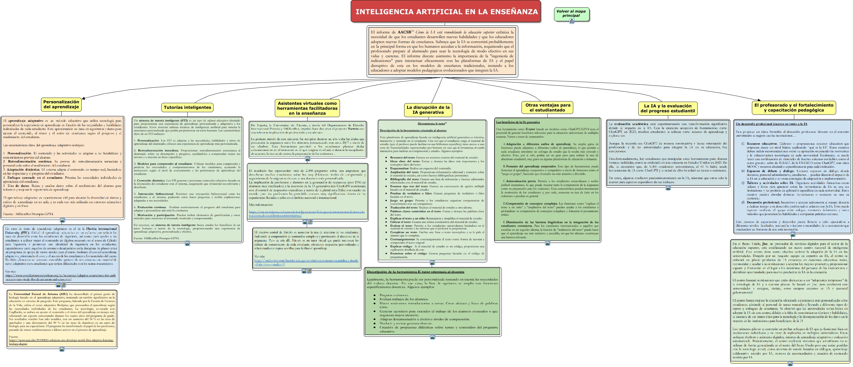 Este Cmap, tiene información relacionada con: INTELIGENCIA ARTIFICIAL EN LA ENSEÑANZA, La IA y la evaluación del progreso estudiantil, Asistentes virtuales como herramientas facilitadoras en la enseñanza, Tutorías inteligentes, Personalización del aprendizaje, La disrupción de la IA generativa, INTELIGENCIA ARTIFICIAL EN LA ENSEÑANZA, Tutorías inteligentes, Otras ventajas para el estudiantado, La IA y la evaluación del progreso estudiantil, Otras ventajas para el estudiantado, El profesorado y el fortalecimiento y capacitación pedagógica, La disrupción de la IA generativa, Personalización del aprendizaje, El profesorado y el fortalecimiento y capacitación pedagógica, Asistentes virtuales como herramientas facilitadoras en la enseñanza