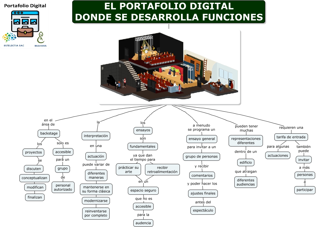 Este Cmap, tiene información relacionada con: Como Funciones, pueden tener muchas representaciones diferentes, en el área de backstage, interpretación en una actuación, requieren una tarifa de entrada, fundamentales ya que dan el tiempo para prácticar su arte, grupo de personal autorizado, tarifa de entrada para algunas actuaciones, grupo de personas y recibir comentarios, ensayos son fundamentales, a menudo se programa un ensayo general, proyectos se discuten, actuación puede variar de diferentes maneras, prácticar su arte en un espacio seguro, ensayo general para invitar a un grupo de personas, invitar a más personas, ajustes finales antes del espectáculo, backstage solo es accesible, EL PORTAFOLIO DIGITAL DONDE SE DESARROLLA FUNCIONES, discuten finalizan, representaciones diferentes dentro de un edificio