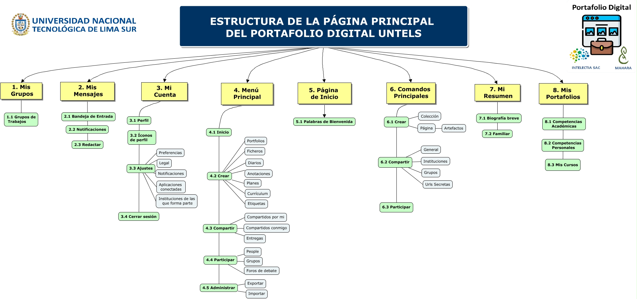 Este Cmap, tiene información relacionada con: ESTRUCTURA DE LA PAGINA PRINCIPAL PORTAFOLIO DIGITAL, ESTRUCTURA DE LA PÁGINA PRINCIPAL DEL PORTAFOLIO DIGITAL UNTELS 5. Página de Inicio, 4.4 Participar Grupos, 2. Mis Mensajes 2.3 Redactar, 6.2 Compartir Urls Secretas, 3.3 Ajustes Legal, 4.2 Crear Ficheros, 6.2 Compartir Grupos, ESTRUCTURA DE LA PÁGINA PRINCIPAL DEL PORTAFOLIO DIGITAL UNTELS 8. Mis Portafolios, 4.3 Compartir Entregas, 4.4 Participar Foros de debate, 4.5 Administrar Importar, 3.3 Ajustes Aplicaciones conectadas, ESTRUCTURA DE LA PÁGINA PRINCIPAL DEL PORTAFOLIO DIGITAL UNTELS 6. Comandos Principales, 8. Mis Portafolios 8.3 Mis Cursos, 4.2 Crear Portfolios, ESTRUCTURA DE LA PÁGINA PRINCIPAL DEL PORTAFOLIO DIGITAL UNTELS 1. Mis Grupos, 4.3 Compartir Compartidos por mi, ESTRUCTURA DE LA PÁGINA PRINCIPAL DEL PORTAFOLIO DIGITAL UNTELS 7. Mi Resumen, 3. Mi Cuenta 3.1 Perfil, 6.2 Compartir Instituciones