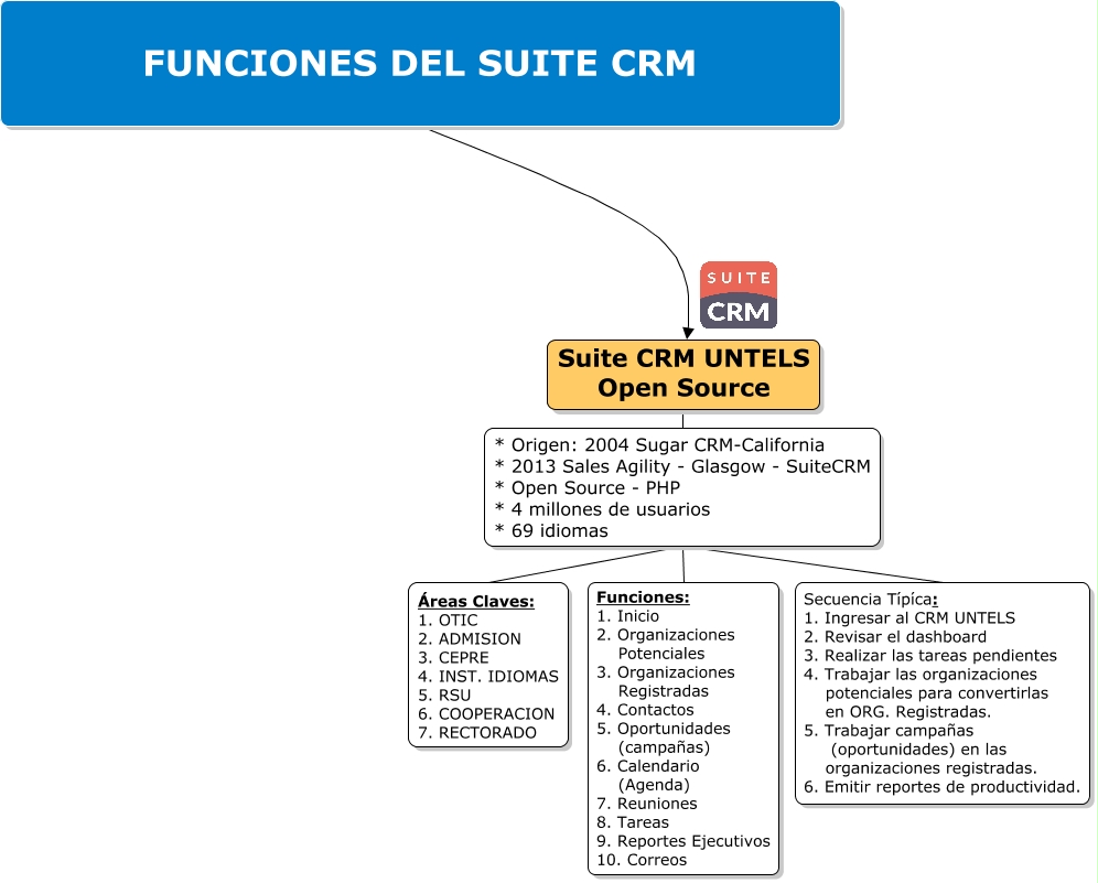 Este Cmap, tiene información relacionada con: FUNCIONES DEL SUITE CRM, * Origen: 2004 Sugar CRM-California * 2013 Sales Agility - Glasgow - SuiteCRM * Open Source - PHP * 4 millones de usuarios * 69 idiomas Funciones: 1. Inicio 2. Organizaciones Potenciales 3. Organizaciones Registradas 4. Contactos 5. Oportunidades (campañas) 6. Calendario (Agenda) 7. Reuniones 8. Tareas 9. Reportes Ejecutivos 10. Correos, * Origen: 2004 Sugar CRM-California * 2013 Sales Agility - Glasgow - SuiteCRM * Open Source - PHP * 4 millones de usuarios * 69 idiomas Secuencia Típíca: 1. Ingresar al CRM UNTELS 2. Revisar el dashboard 3. Realizar las tareas pendientes 4. Trabajar las organizaciones potenciales para convertirlas en ORG. Registradas. 5. Trabajar campañas (oportunidades) en las organizaciones registradas. 6. Emitir reportes de productividad., * Origen: 2004 Sugar CRM-California * 2013 Sales Agility - Glasgow - SuiteCRM * Open Source - PHP * 4 millones de usuarios * 69 idiomas Áreas Claves: 1. OTIC 2. ADMISION 3. CEPRE 4. INST. IDIOMAS 5. RSU 6. COOPERACION 7. RECTORADO, FUNCIONES DEL SUITE CRM Suite CRM UNTELS Open Source, Suite CRM UNTELS Open Source * Origen: 2004 Sugar CRM-California * 2013 Sales Agility - Glasgow - SuiteCRM * Open Source - PHP * 4 millones de usuarios * 69 idiomas