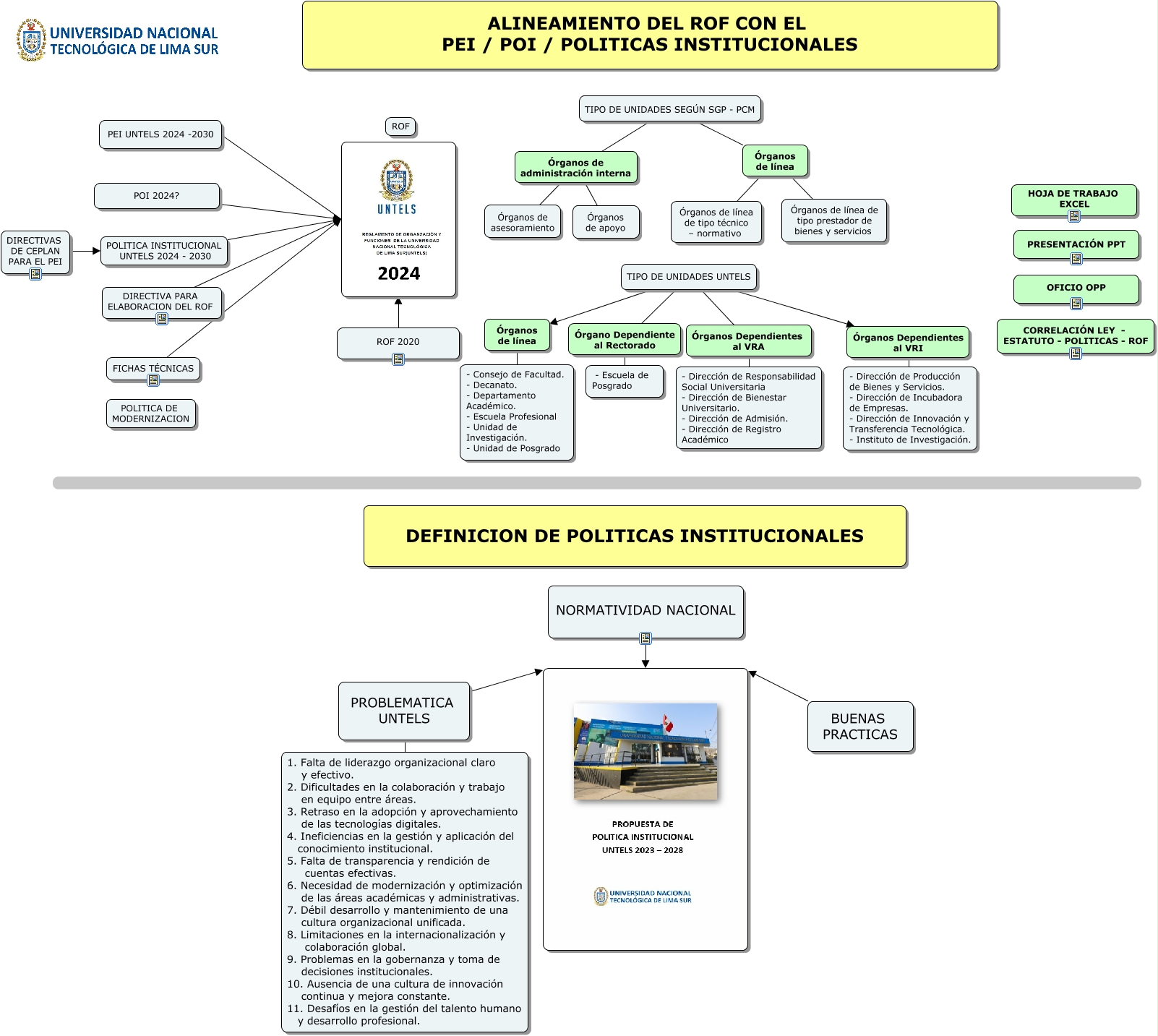 Este Cmap, tiene información relacionada con: ALINEAMIENTO DEL ROF CON EL PEI - POI - POLITICAS INSTITUCIONALES, ROF 2020, PEI UNTELS 2024 -2030, PROBLEMATICA UNTELS 1. Falta de liderazgo organizacional claro y efectivo. 2. Dificultades en la colaboración y trabajo en equipo entre áreas. 3. Retraso en la adopción y aprovechamiento de las tecnologías digitales. 4. Ineficiencias en la gestión y aplicación del conocimiento institucional. 5. Falta de transparencia y rendición de cuentas efectivas. 6. Necesidad de modernización y optimización de las áreas académicas y administrativas. 7. Débil desarrollo y mantenimiento de una cultura organizacional unificada. 8. Limitaciones en la internacionalización y colaboración global. 9. Problemas en la gobernanza y toma de decisiones institucionales. 10. Ausencia de una cultura de innovación continua y mejora constante. 11. Desafíos en la gestión del talento humano y desarrollo profesional., TIPO DE UNIDADES SEGÚN SGP - PCM Órganos de administración interna, Órganos de línea Órganos de línea de tipo técnico – normativo, NORMATIVIDAD NACIONAL, DIRECTIVA PARA ELABORACION DEL ROF, TIPO DE UNIDADES UNTELS Órganos Dependientes al VRI, Órgano Dependiente al Rectorado - Escuela de Posgrado, Órganos de administración interna Órganos de asesoramiento, POLITICA INSTITUCIONAL UNTELS 2024 - 2030, POI 2024?, Órganos Dependientes al VRI - Dirección de Producción de Bienes y Servicios. - Dirección de Incubadora de Empresas. - Dirección de Innovación y Transferencia Tecnológica. - Instituto de Investigación., Órganos de línea - Consejo de Facultad. - Decanato. - Departamento Académico. - Escuela Profesional - Unidad de Investigación. - Unidad de Posgrado, Órganos de administración interna Órganos de apoyo, TIPO DE UNIDADES UNTELS Órgano Dependiente al Rectorado, BUENAS PRACTICAS, Órganos Dependientes al VRA - Dirección de Responsabilidad Social Universitaria - Dirección de Bienestar Universitario. - Dirección de Admisión. - Dirección de Registro Académico, TIPO DE UNIDADES UNTELS Órganos Dependientes al VRA, PROBLEMATICA UNTELS
