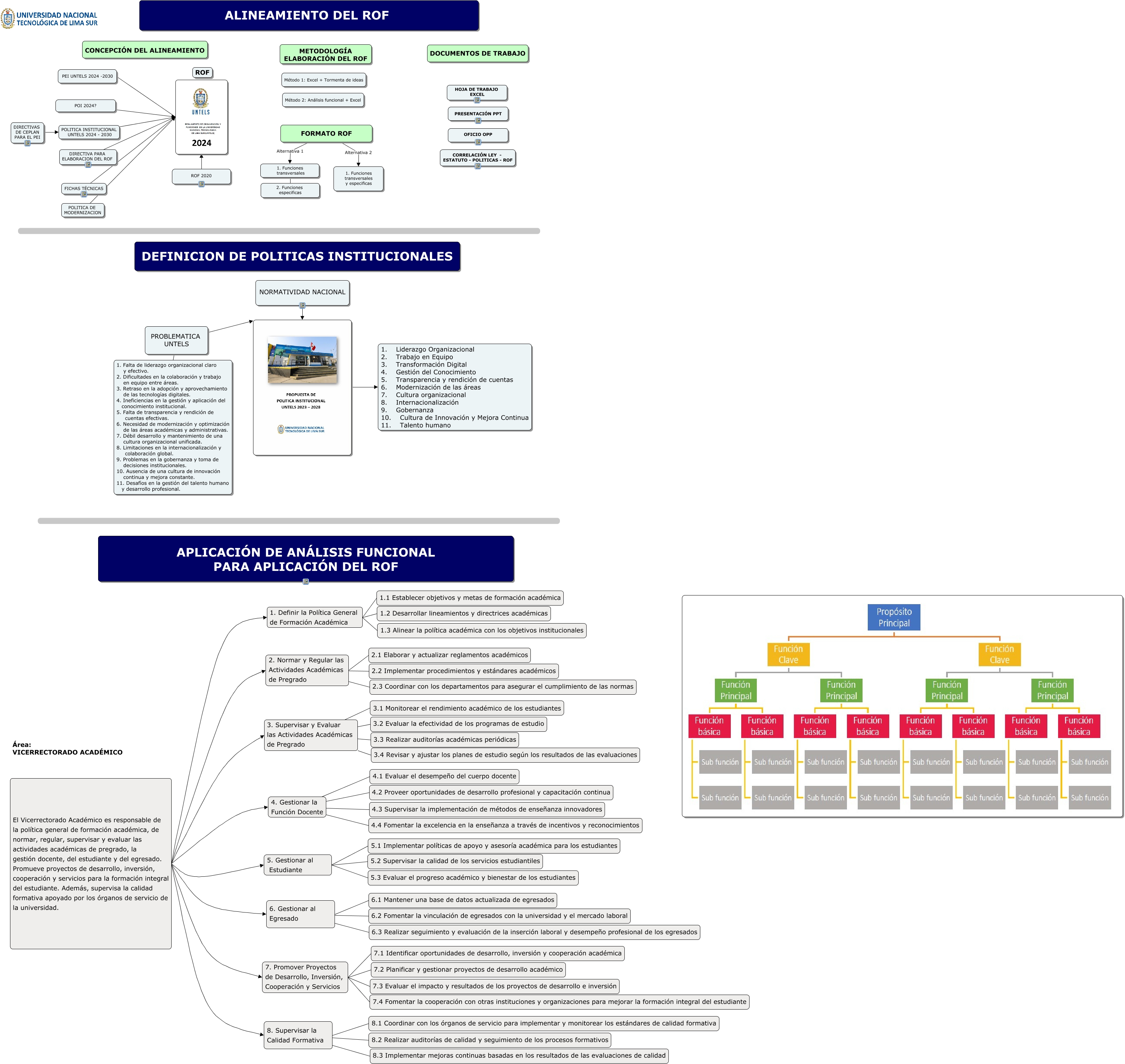 Este Cmap, tiene información relacionada con: FINAL ALINEAMIENTO DEL ROF UNTELS, 7. Promover Proyectos de Desarrollo, Inversión, Cooperación y Servicios 7.4 Fomentar la cooperación con otras instituciones y organizaciones para mejorar la formación integral del estudiante, 1. Definir la Política General de Formación Académica 1.3 Alinear la política académica con los objetivos institucionales, FORMATO ROF Alternativa 1 1. Funciones transversales, 4. Gestionar la Función Docente 4.1 Evaluar el desempeño del cuerpo docente, El Vicerrectorado Académico es responsable de la política general de formación académica, de normar, regular, supervisar y evaluar las actividades académicas de pregrado, la gestión docente, del estudiante y del egresado. Promueve proyectos de desarrollo, inversión, cooperación y servicios para la formación integral del estudiante. Además, supervisa la calidad formativa apoyado por los órganos de servicio de la universidad. 8. Supervisar la Calidad Formativa, El Vicerrectorado Académico es responsable de la política general de formación académica, de normar, regular, supervisar y evaluar las actividades académicas de pregrado, la gestión docente, del estudiante y del egresado. Promueve proyectos de desarrollo, inversión, cooperación y servicios para la formación integral del estudiante. Además, supervisa la calidad formativa apoyado por los órganos de servicio de la universidad. 5. Gestionar al Estudiante, 4. Gestionar la Función Docente 4.3 Supervisar la implementación de métodos de enseñanza innovadores, 1. Liderazgo Organizacional 2. Trabajo en Equipo 3. Transformación Digital 4. Gestión del Conocimiento 5. Transparencia y rendición de cuentas 6. Modernización de las áreas 7. Cultura organizacional 8. Internacionalización 9. Gobernanza 10. Cultura de Innovación y Mejora Continua 11. Talento humano, 1. Definir la Política General de Formación Académica 1.2 Desarrollar lineamientos y directrices académicas, El Vicerrectorado Académico es responsable de la política general de formación académica, de normar, regular, supervisar y evaluar las actividades académicas de pregrado, la gestión docente, del estudiante y del egresado. Promueve proyectos de desarrollo, inversión, cooperación y servicios para la formación integral del estudiante. Además, supervisa la calidad formativa apoyado por los órganos de servicio de la universidad. 2. Normar y Regular las Actividades Académicas de Pregrado, 1. Funciones transversales 2. Funciones especificas, FORMATO ROF Alternativa 2 1. Funciones transversales y especificas, 3. Supervisar y Evaluar las Actividades Académicas de Pregrado 3.3 Realizar auditorías académicas periódicas, 3. Supervisar y Evaluar las Actividades Académicas de Pregrado 3.2 Evaluar la efectividad de los programas de estudio, 1. Definir la Política General de Formación Académica 1.1 Establecer objetivos y metas de formación académica, ROF 2020, El Vicerrectorado Académico es responsable de la política general de formación académica, de normar, regular, supervisar y evaluar las actividades académicas de pregrado, la gestión docente, del estudiante y del egresado. Promueve proyectos de desarrollo, inversión, cooperación y servicios para la formación integral del estudiante. Además, supervisa la calidad formativa apoyado por los órganos de servicio de la universidad. 6. Gestionar al Egresado, DIRECTIVAS DE CEPLAN PARA EL PEI POLITICA INSTITUCIONAL UNTELS 2024 - 2030, 6. Gestionar al Egresado 6.3 Realizar seguimiento y evaluación de la inserción laboral y desempeño profesional de los egresados, FICHAS TÉCNICAS