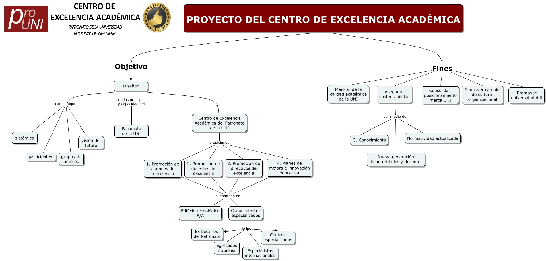 Este Cmap, tiene información relacionada con: PROYECTO DEL CENTRO DE EXCELENCIA DEL PATRONATO DE LA UNI, PROYECTO DEL CENTRO DE EXCELENCIA ACADÉMICA Fines Promover cambio de cultura organizacional, Diseñar con enfoque grupos de interés, 2. Promoción de docentes de excelencia sustentado en Conocimientos especializados, 3. Promoción de directivos de excelencia sustentado en Edificio tecnológico E/A, Diseñar con los principios y capacidad del Patronato de la UNI, Centro de Excelencia Académica del Patronato de la UNI propiciando 3. Promoción de directivos de excelencia, 1. Promoción de alumnos de excelencia sustentado en Edificio tecnológico E/A, Asegurar sustentabilidad por medio de Nueva generación de autoridades y docentes, PROYECTO DEL CENTRO DE EXCELENCIA ACADÉMICA Fines Mejorar de la calidad académica de la UNI, Conocimientos especializados de los Especialistas internacionales, 1. Promoción de alumnos de excelencia sustentado en Conocimientos especializados, Conocimientos especializados de los Centros especializados, 2. Promoción de docentes de excelencia sustentado en Edificio tecnológico E/A, Diseñar con enfoque sistémico, Diseñar con enfoque visión del futuro, PROYECTO DEL CENTRO DE EXCELENCIA ACADÉMICA Fines Consolidar posicionamiento marca UNI, Conocimientos especializados de los Ex becarios del Patronato, Centro de Excelencia Académica del Patronato de la UNI propiciando 4. Planes de mejora e innovación educativa, Conocimientos especializados de los Egresados notables, Diseñar con enfoque participativo