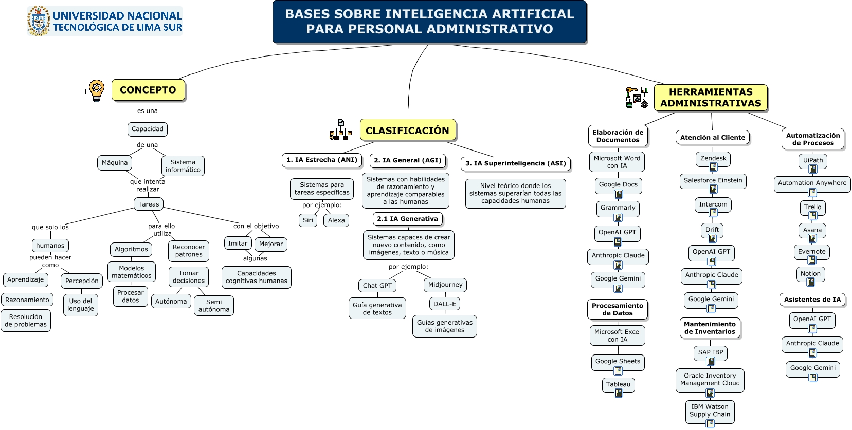 Este Cmap, tiene información relacionada con: BASE SOBRE INTELIGENCIA ARTIFICIAL PARA PERSONAL ADMINISTRATIVO, Elaboración de Documentos Google Gemini, Algoritmos Procesar datos, humanos pueden hacer como Aprendizaje, Máquina que intenta realizar Tareas, Sistemas capaces de crear nuevo contenido, como imágenes, texto o música por ejemplo: Chat GPT, Tareas para ello utiliza Algoritmos, Tareas para ello utiliza Reconocer patrones, Reconocer patrones Tomar decisiones, CLASIFICACIÓN 3. IA Superinteligencia (ASI), CLASIFICACIÓN 2. IA General (AGI), Tareas que solo los humanos, Tomar decisiones Semi autónoma, Mantenimiento de Inventarios IBM Watson Supply Chain, Midjourney Guías generativas de imágenes, Tareas con el objetivo Mejorar, Sistemas para tareas específicas por ejemplo: Siri, Procesamiento de Datos Tableau, 1. IA Estrecha (ANI) Sistemas para tareas específicas, Asistentes de IA Google Gemini, Sistemas para tareas específicas por ejemplo: Alexa