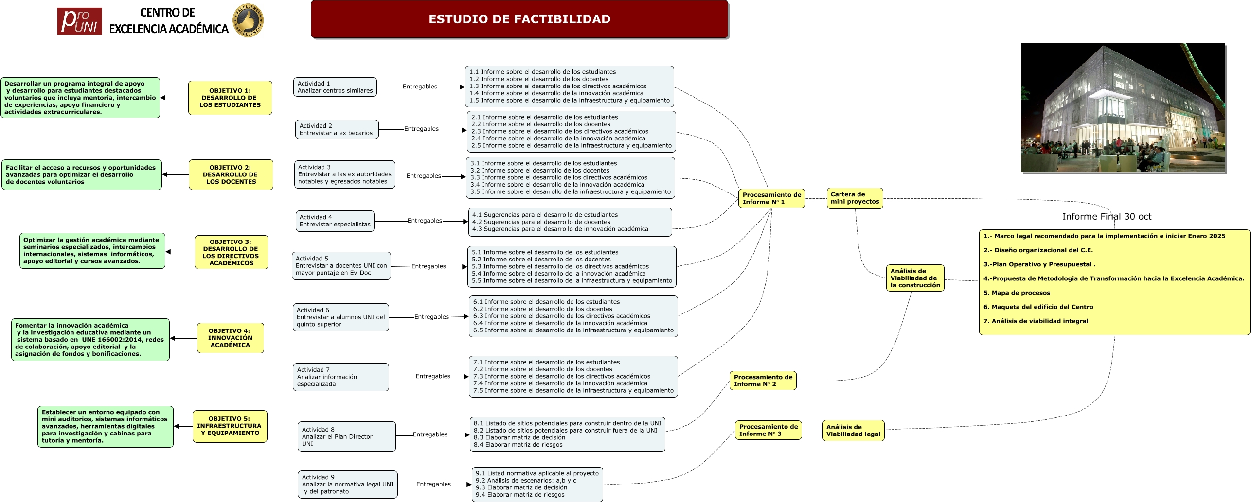 Este Cmap, tiene información relacionada con: ESTUDIO DE FACTIBILIDAD, 4.1 Sugerencias para el desarrollo de estudiantes 4.2 Sugerencias para el desarrollo de docentes 4.3 Sugerencias para el desarrollo de innovación académica Procesamiento de Informe N° 1, Actividad 7 Analizar información especializada Entregables 7.1 Informe sobre el desarrollo de los estudiantes 7.2 Informe sobre el desarrollo de los docentes 7.3 Informe sobre el desarrollo de los directivos académicos 7.4 Informe sobre el desarrollo de la innovación académica 7.5 Informe sobre el desarrollo de la infraestructura y equipamiento, OBJETIVO 2: DESARROLLO DE LOS DOCENTES Facilitar el acceso a recursos y oportunidades avanzadas para optimizar el desarrollo de docentes voluntarios, 9.1 Listad normativa aplicable al proyecto 9.2 Análisis de escenarios: a,b y c 9.3 Elaborar matriz de decisión 9.4 Elaborar matriz de riesgos Procesamiento de Informe N° 3, Análisis de Viabiliadad de la construcción Cartera de mini proyectos, Actividad 9 Analizar la normativa legal UNI y del patronato Entregables 9.1 Listad normativa aplicable al proyecto 9.2 Análisis de escenarios: a,b y c 9.3 Elaborar matriz de decisión 9.4 Elaborar matriz de riesgos, 7.1 Informe sobre el desarrollo de los estudiantes 7.2 Informe sobre el desarrollo de los docentes 7.3 Informe sobre el desarrollo de los directivos académicos 7.4 Informe sobre el desarrollo de la innovación académica 7.5 Informe sobre el desarrollo de la infraestructura y equipamiento Procesamiento de Informe N° 1, Análisis de Viabiliadad de la construcción Procesamiento de Informe N° 2, Actividad 4 Entrevistar especialistas Entregables 4.1 Sugerencias para el desarrollo de estudiantes 4.2 Sugerencias para el desarrollo de docentes 4.3 Sugerencias para el desarrollo de innovación académica, Cartera de mini proyectos 1.- Marco legal recomendado para la implementación e iniciar Enero 2025 2.- Diseño organizacional del C.E. 3.-Plan Operativo y Presupuestal . 4.-Propuesta de Metodologia de Transformación hacia la Excelencia Académica. 5. Mapa de procesos 6. Maqueta del edificio del Centro 7. Análisis de viabilidad integral, Actividad 3 Entrevistar a las ex autoridades notables y egresados notables Entregables 3.1 Informe sobre el desarrollo de los estudiantes 3.2 Informe sobre el desarrollo de los docentes 3.3 Informe sobre el desarrollo de los directivos académicos 3.4 Informe sobre el desarrollo de la innovación académica 3.5 Informe sobre el desarrollo de la infraestructura y equipamiento, Procesamiento de Informe N° 1 Cartera de mini proyectos, 2.1 Informe sobre el desarrollo de los estudiantes 2.2 Informe sobre el desarrollo de los docentes 2.3 Informe sobre el desarrollo de los directivos académicos 2.4 Informe sobre el desarrollo de la innovación académica 2.5 Informe sobre el desarrollo de la infraestructura y equipamiento Procesamiento de Informe N° 1, Actividad 5 Entrevistar a docentes UNI con mayor puntaje en Ev-Doc Entregables 5.1 Informe sobre el desarrollo de los estudiantes 5.2 Informe sobre el desarrollo de los docentes 5.3 Informe sobre el desarrollo de los directivos académicos 5.4 Informe sobre el desarrollo de la innovación académica 5.5 Informe sobre el desarrollo de la infraestructura y equipamiento, Actividad 8 Analizar el Plan Director UNI Entregables 8.1 Listado de sitios potenciales para construir dentro de la UNI 8.2 Listado de sitios potenciales para construir fuera de la UNI 8.3 Elaborar matriz de decisión 8.4 Elaborar matriz de riesgos, 1.1 Informe sobre el desarrollo de los estudiantes 1.2 Informe sobre el desarrollo de los docentes 1.3 Informe sobre el desarrollo de los directivos académicos 1.4 Informe sobre el desarrollo de la innovación académica 1.5 Informe sobre el desarrollo de la infraestructura y equipamiento Procesamiento de Informe N° 1, Análisis de Viabiliadad legal 1.- Marco legal recomendado para la implementación e iniciar Enero 2025 2.- Diseño organizacional del C.E. 3.-Plan Operativo y Presupuestal . 4.-Propuesta de Metodologia de Transformación hacia la Excelencia Académica. 5. Mapa de procesos 6. Maqueta del edificio del Centro 7. Análisis de viabilidad integral, OBJETIVO 4: INNOVACIÓN ACADÉMICA Fomentar la innovación académica y la investigación educativa mediante un sistema basado en UNE 166002:2014, redes de colaboración, apoyo editorial y la asignación de fondos y bonificaciones., Actividad 1 Analizar centros similares Entregables 1.1 Informe sobre el desarrollo de los estudiantes 1.2 Informe sobre el desarrollo de los docentes 1.3 Informe sobre el desarrollo de los directivos académicos 1.4 Informe sobre el desarrollo de la innovación académica 1.5 Informe sobre el desarrollo de la infraestructura y equipamiento, Actividad 2 Entrevistar a ex becarios Entregables 2.1 Informe sobre el desarrollo de los estudiantes 2.2 Informe sobre el desarrollo de los docentes 2.3 Informe sobre el desarrollo de los directivos académicos 2.4 Informe sobre el desarrollo de la innovación académica 2.5 Informe sobre el desarrollo de la infraestructura y equipamiento