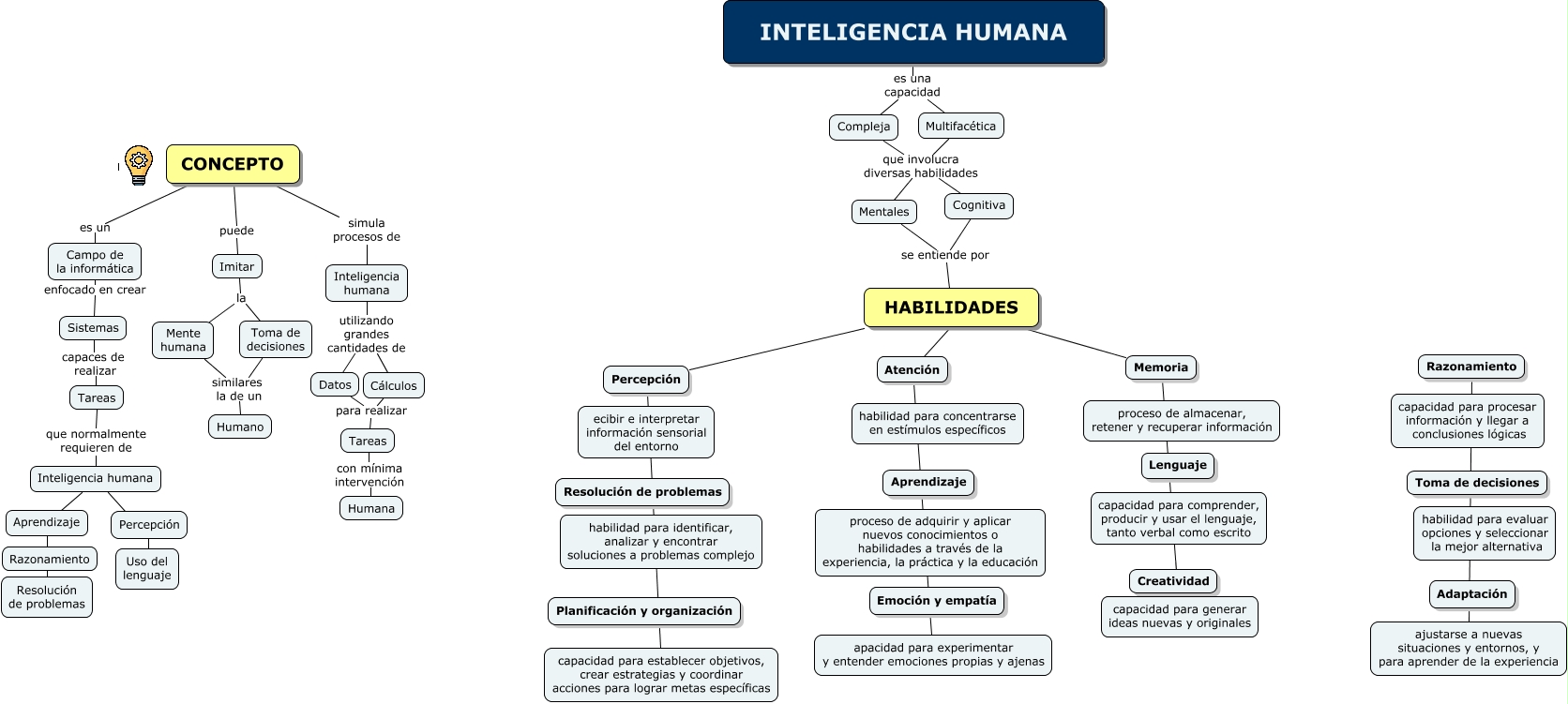 Este Cmap, tiene información relacionada con: INTELIGENCIA HUMANA, HABILIDADES Memoria, Compleja que involucra diversas habilidades Cognitiva, Cálculos para realizar Tareas, Toma de decisiones similares la de un Humano, Aprendizaje Resolución de problemas, CONCEPTO puede Imitar, Multifacética que involucra diversas habilidades Mentales, Inteligencia humana Aprendizaje, INTELIGENCIA HUMANA es una capacidad Compleja, Memoria capacidad para generar ideas nuevas y originales, Imitar la Mente humana, Tareas con mínima intervención Humana, HABILIDADES Atención, Campo de la informática enfocado en crear Sistemas, Imitar la Toma de decisiones, INTELIGENCIA HUMANA es una capacidad Multifacética, Inteligencia humana utilizando grandes cantidades de Datos, Tareas que normalmente requieren de Inteligencia humana, CONCEPTO simula procesos de Inteligencia humana, Multifacética que involucra diversas habilidades Cognitiva