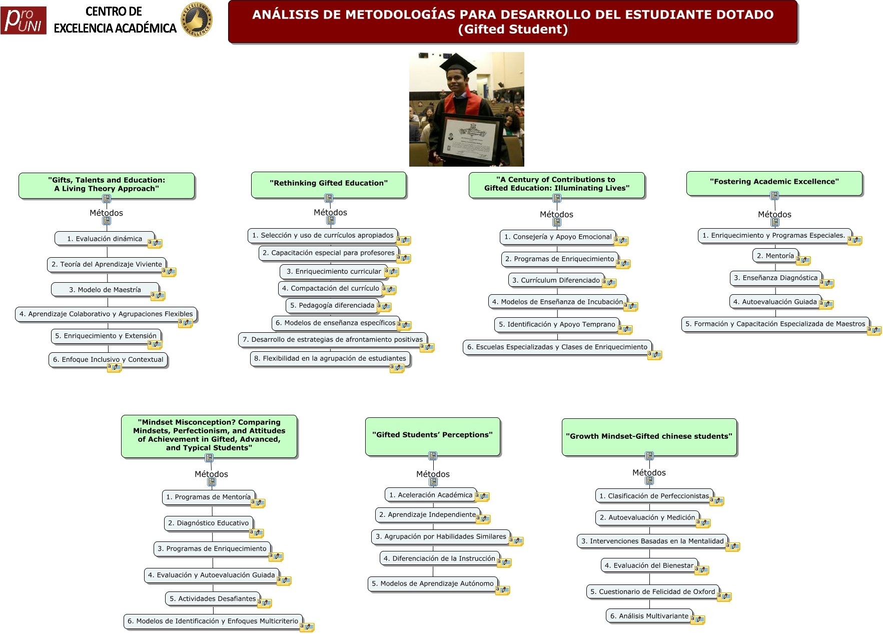 Este Cmap, tiene información relacionada con: ANÁLISIS DE METODOLOGÍAS PARA DESARROLLO DEL ESTUDIANTE DOTADO, "Growth Mindset-Gifted chinese students" Métodos 6. Análisis Multivariante, "Fostering Academic Excellence" Métodos 5. Formación y Capacitación Especializada de Maestros, "Rethinking Gifted Education" Métodos 8. Flexibilidad en la agrupación de estudiantes, "A Century of Contributions to Gifted Education: Illuminating Lives" Métodos 6. Escuelas Especializadas y Clases de Enriquecimiento, "Gifts, Talents and Education: A Living Theory Approach" Métodos 6. Enfoque Inclusivo y Contextual, "Gifted Students’ Perceptions" Métodos 5. Modelos de Aprendizaje Autónomo, "Mindset Misconception? Comparing Mindsets, Perfectionism, and Attitudes of Achievement in Gifted, Advanced, and Typical Students" Métodos 6. Modelos de Identificación y Enfoques Multicriterio