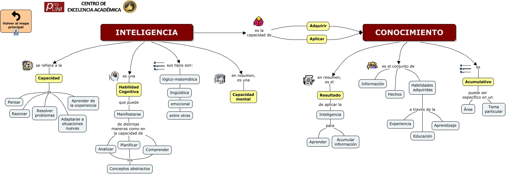 Este Cmap, tiene información relacionada con: INTELIGENCIA Y CONOCIMIENTO, CONOCIMIENTO es el conjunto de Hechos, Habilidades adquiridas a través de la Experiencia, Capacidad de Resolver problemas, Comprender los Conceptos abstractos, INTELIGENCIA es la capacidad de Aplicar, Capacidad de Pensar, Inteligencia para Aprender, INTELIGENCIA es una Habilidad Cognitiva, CONOCIMIENTO es el conjunto de Habilidades adquiridas, Acumulativo puede ser específico en un Área, Manifestarse de distintas maneras como en la capacidad de Planificar, Manifestarse de distintas maneras como en la capacidad de Comprender, Capacidad de Razonar, Adquirir CONOCIMIENTO, Aplicar CONOCIMIENTO, Habilidad Cognitiva que puede Manifestarse, Analizar los Conceptos abstractos, Capacidad de Aprender de la experiencia, Resultado de aplicar la Inteligencia, CONOCIMIENTO es el conjunto de Información
