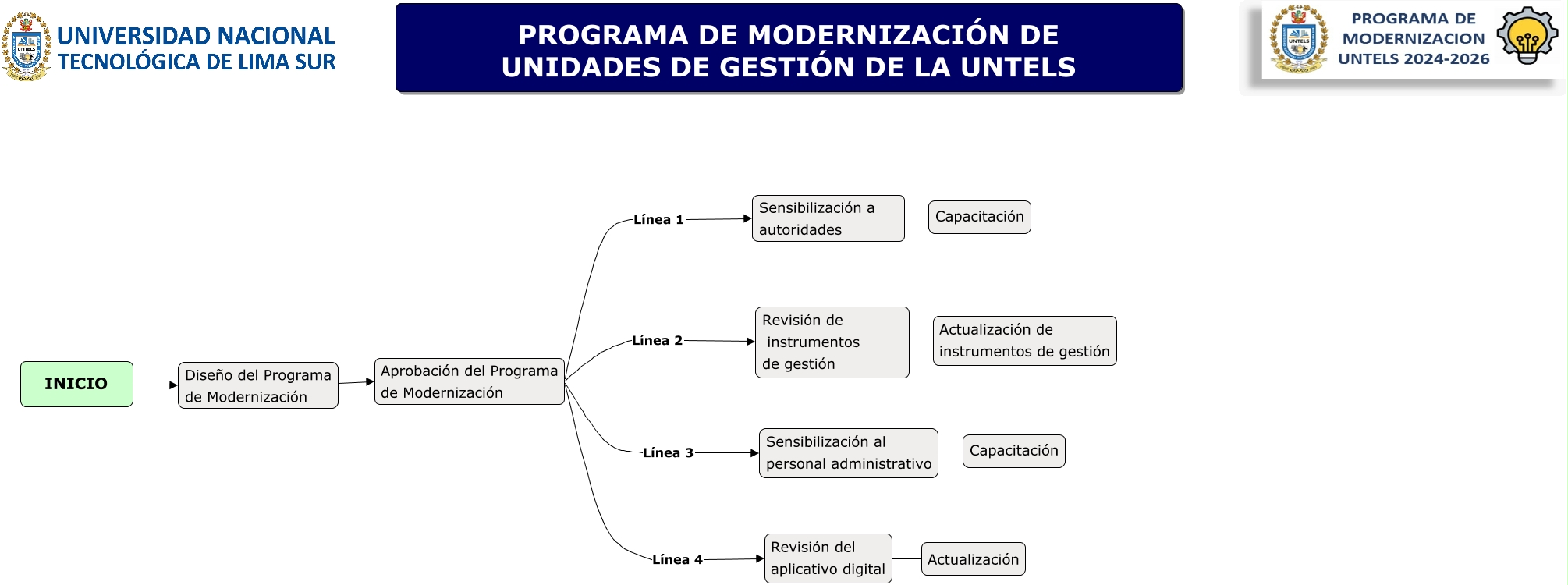 Este Cmap, tiene información relacionada con: PROGRAMA DE MODERNIZACION UNTELS, INICIO Diseño del Programa de Modernización, Revisión del aplicativo digital Actualización, Aprobación del Programa de Modernización Línea 4 Revisión del aplicativo digital, Aprobación del Programa de Modernización Línea 2 Revisión de instrumentos de gestión, Sensibilización a autoridades Capacitación, Sensibilización al personal administrativo Capacitación, Revisión de instrumentos de gestión Actualización de instrumentos de gestión, Aprobación del Programa de Modernización Línea 1 Sensibilización a autoridades, Aprobación del Programa de Modernización Línea 3 Sensibilización al personal administrativo, Diseño del Programa de Modernización Aprobación del Programa de Modernización