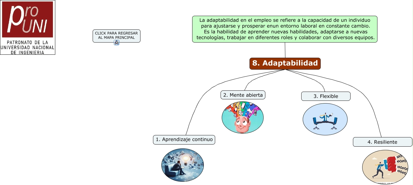 Este Cmap, tiene información relacionada con: 8. Adaptabilidad, 8. Adaptabilidad 4. Resiliente, 8. Adaptabilidad 2. Mente abierta, 8. Adaptabilidad 3. Flexible, 8. Adaptabilidad 1. Aprendizaje continuo, La adaptabilidad en el empleo se refiere a la capacidad de un individuo para ajustarse y prosperar enun entorno laboral en constante cambio. Es la habilidad de aprender nuevas habilidades, adaptarse a nuevas tecnologías, trabajar en diferentes roles y colaborar con diversos equipos. 8. Adaptabilidad