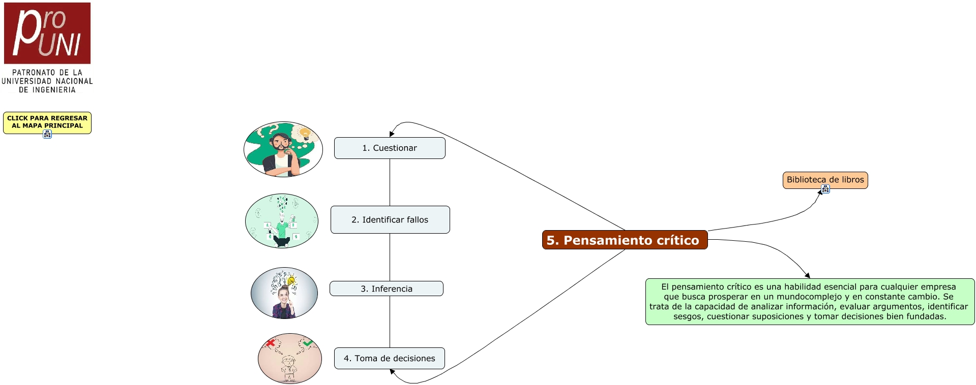 Este Cmap, tiene información relacionada con: 5. Pensamiento crítico y cognitivo, 5. Pensamiento crítico El pensamiento crítico es una habilidad esencial para cualquier empresa que busca prosperar en un mundocomplejo y en constante cambio. Se trata de la capacidad de analizar información, evaluar argumentos, identificar sesgos, cuestionar suposiciones y tomar decisiones bien fundadas., 5. Pensamiento crítico 4. Toma de decisiones, 5. Pensamiento crítico Biblioteca de libros, 5. Pensamiento crítico 1. Cuestionar, 1. Cuestionar 4. Toma de decisiones