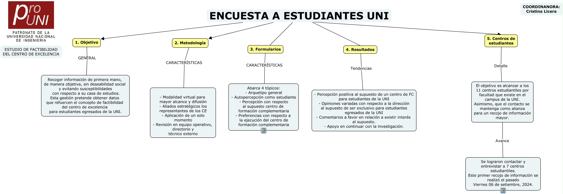 Este Cmap, tiene información relacionada con: ENCUESTAS A ESTUDIANTES UNI, 2. Metodología CARACTERÍSTICAS - Modalidad virtual para mayor alcance y difusión - Aliados estratégicos los representantes de los CE - Aplicación de un solo momento - Revisión en equipo operativo, directorio y técnico externo, 5. Centros de estudiantes Detalle El objetivo es alcanzar a los 11 centros estudiantiles por facultad que existe en el campus de la UNI. Asimismo, que el contacto se mantenga como alianza para un recojo de información mayor., ENCUESTA A ESTUDIANTES UNI ???? 5. Centros de estudiantes, ENCUESTA A ESTUDIANTES UNI 3. Formularios, ENCUESTA A ESTUDIANTES UNI 4. Resultados, ENCUESTA A ESTUDIANTES UNI 1. Objetivo, 1. Objetivo GENERAL Recoger información de primera mano, de manera objetiva, sin deseabilidad social y evitando susceptibilidades con respecto a su casa de estudios. Esta gestión pretende obtener datos que refuercen el concepto de factibilidad del centro de excelencia para estudiantes egresados de la UNI., 4. Resultados Tendencias - Percepción positiva al supuesto de un centro de FC para estudiantes de la UNI - Opiniones variadas con respecto a la dirección al supuesto de ser exclusivo para estudiantes egresados de la UNI - Comentarios a favor en relación a existir interés al supuesto. - Apoyo en continuar con la investigación., El objetivo es alcanzar a los 11 centros estudiantiles por facultad que existe en el campus de la UNI. Asimismo, que el contacto se mantenga como alianza para un recojo de información mayor. Avance Se lograron contactar y entrevistar a 7 centros estudiantiles. Este primer recojo de información se realizó el pasado Viernes 06 de setiembre, 2024., ENCUESTA A ESTUDIANTES UNI 2. Metodología, 3. Formularios CARACTERÍSTICAS Abarca 4 tópicos: - Arquetipo general - Autopercepción como estudiante - Percepción con respecto al supuesto centro de formación complementaria - Preferencias con respecto a la ejecución del centro de formación complementaria