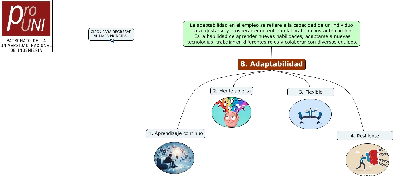 Este Cmap, tiene información relacionada con: 8. Adaptabilidad, 8. Adaptabilidad 1. Aprendizaje continuo, La adaptabilidad en el empleo se refiere a la capacidad de un individuo para ajustarse y prosperar enun entorno laboral en constante cambio. Es la habilidad de aprender nuevas habilidades, adaptarse a nuevas tecnologías, trabajar en diferentes roles y colaborar con diversos equipos. 8. Adaptabilidad, 8. Adaptabilidad 4. Resiliente, 8. Adaptabilidad 3. Flexible, 8. Adaptabilidad 2. Mente abierta