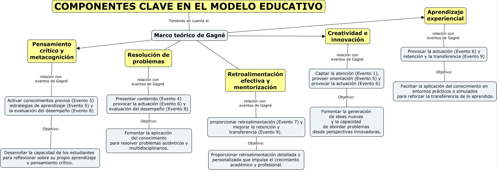 Este Cmap, tiene información relacionada con: Componentes en relación con modelo Gagné, Provocar la actuación (Evento 6) y retención y la transferencia (Evento 9) Objetivo: Facilitar la aplicación del conocimiento en entornos prácticos o simulados para reforzar la transferencia de lo aprendido., Marco teórico de Gagné Pensamiento crítico y metacognición, Marco teórico de Gagné Aprendizaje experiencial, Activar conocimientos previos (Evento 3) estrategias de aprendizaje (Evento 5) y la evaluación del desempeño (Evento 8) Objetivo: Desarrollar la capacidad de los estudiantes para reflexionar sobre su propio aprendizaje y pensamiento crítico., Marco teórico de Gagné Resolución de problemas, Presentar contenido (Evento 4) provocar la actuación (Evento 6) y evaluación del desempeño (Evento 8) Objetivo: Fomentar la aplicación del conocimiento para resolver problemas auténticos y multidisciplinarios., Marco teórico de Gagné Creatividad e innovación, Pensamiento crítico y metacognición relación con eventos de Gagné Activar conocimientos previos (Evento 3) estrategias de aprendizaje (Evento 5) y la evaluación del desempeño (Evento 8), Resolución de problemas relación con eventos de Gagné Presentar contenido (Evento 4) provocar la actuación (Evento 6) y evaluación del desempeño (Evento 8), Captar la atención (Evento 1), proveer orientación (Evento 5) y provocar la actuación (Evento 6) Objetivo: Fomentar la generación de ideas nuevas y la capacidad de abordar problemas desde perspectivas innovadoras., Retroalimentación efectiva y mentorización relación con eventos de Gagné proporcionar retroalimentación (Evento 7) y mejorar la retención y transferencia (Evento 9)., Creatividad e innovación relación con eventos de Gagné Captar la atención (Evento 1), proveer orientación (Evento 5) y provocar la actuación (Evento 6), COMPONENTES CLAVE EN EL MODELO EDUCATIVO Teniendo en cuenta el Marco teórico de Gagné, Marco teórico de Gagné Retroalimentación efectiva y mentorización, proporcionar retroalimentación (Evento 7) y mejorar la retención y transferencia (Evento 9). Objetivo: Proporcionar retroalimentación detallada y personalizada que impulse el crecimiento académico y profesional., Aprendizaje experiencial relación con eventos de Gagné Provocar la actuación (Evento 6) y retención y la transferencia (Evento 9)
