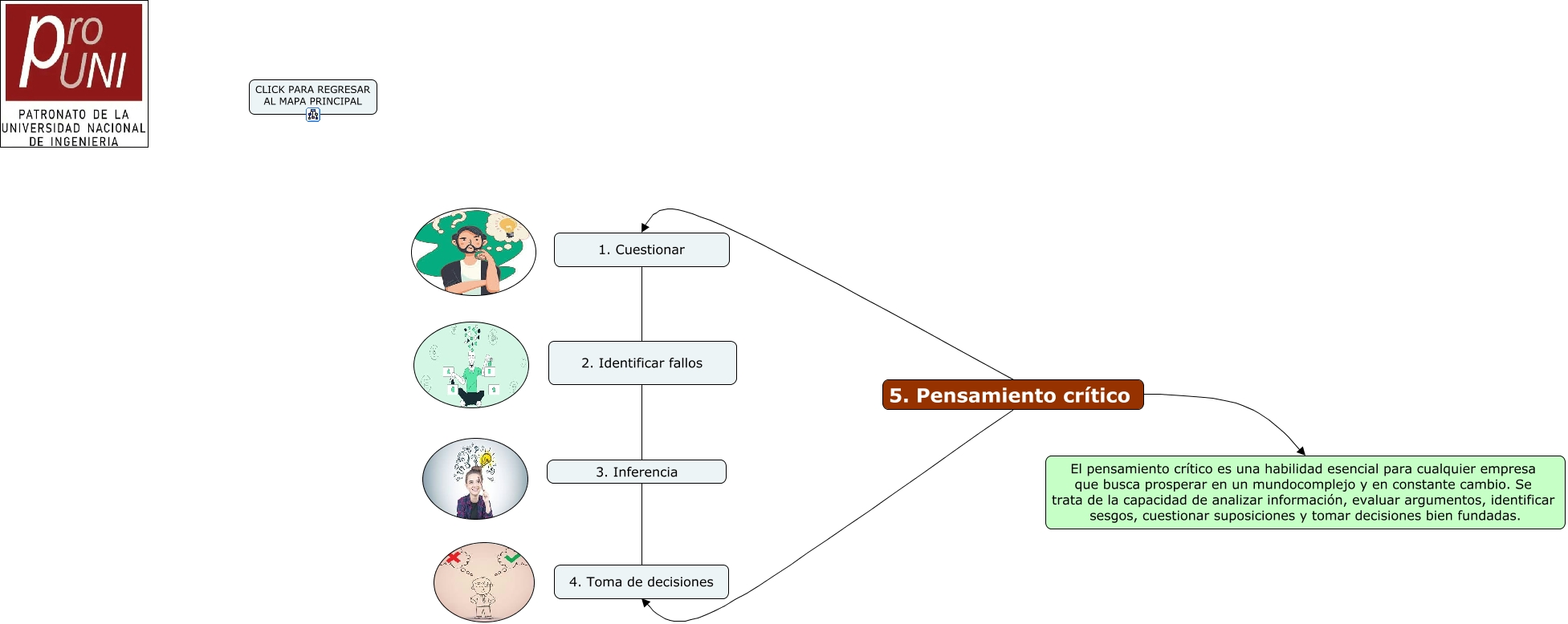 Este Cmap, tiene información relacionada con: 5. Pensamiento crítico y cognitivo, 5. Pensamiento crítico El pensamiento crítico es una habilidad esencial para cualquier empresa que busca prosperar en un mundocomplejo y en constante cambio. Se trata de la capacidad de analizar información, evaluar argumentos, identificar sesgos, cuestionar suposiciones y tomar decisiones bien fundadas., 1. Cuestionar 4. Toma de decisiones, 5. Pensamiento crítico 1. Cuestionar, 5. Pensamiento crítico 4. Toma de decisiones