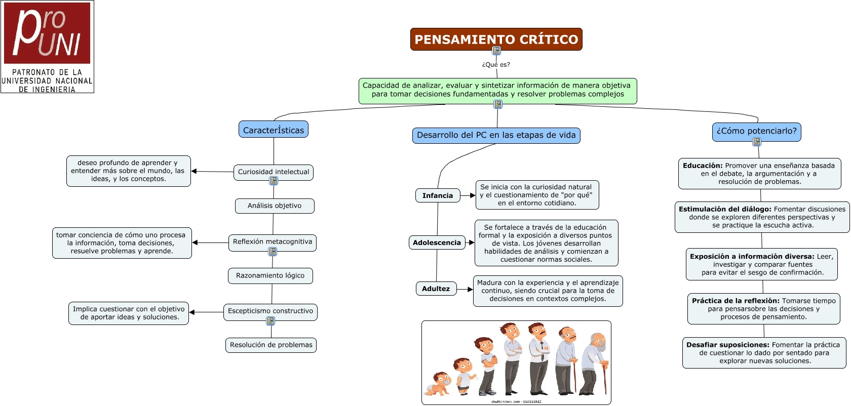 Este Cmap, tiene información relacionada con: Recurso Pensamiento Crítico, Capacidad de analizar, evaluar y sintetizar información de manera objetiva para tomar decisiones fundamentadas y resolver problemas complejos CaracterÍsticas, Escepticismo constructivo Implica cuestionar con el objetivo de aportar ideas y soluciones., Curiosidad intelectual deseo profundo de aprender y entender más sobre el mundo, las ideas, y los conceptos., Educación: Promover una enseñanza basada en el debate, la argumentación y a resolución de problemas. Desafiar suposiciones: Fomentar la práctica de cuestionar lo dado por sentado para explorar nuevas soluciones., Reflexión metacognitiva tomar conciencia de cómo uno procesa la información, toma decisiones, resuelve problemas y aprende., Adolescencia Se fortalece a través de la educación formal y la exposición a diversos puntos de vista. Los jóvenes desarrollan habilidades de análisis y comienzan a cuestionar normas sociales., Adultez Madura con la experiencia y el aprendizaje continuo, siendo crucial para la toma de decisiones en contextos complejos., Infancia Adultez, CaracterÍsticas Curiosidad intelectual, ¿Cómo potenciarlo? Educación: Promover una enseñanza basada en el debate, la argumentación y a resolución de problemas., Curiosidad intelectual Resolución de problemas, Infancia Se inicia con la curiosidad natural y el cuestionamiento de "por qué" en el entorno cotidiano., PENSAMIENTO CRÍTICO ¿Qué es? Capacidad de analizar, evaluar y sintetizar información de manera objetiva para tomar decisiones fundamentadas y resolver problemas complejos, Capacidad de analizar, evaluar y sintetizar información de manera objetiva para tomar decisiones fundamentadas y resolver problemas complejos ¿Cómo potenciarlo?, Capacidad de analizar, evaluar y sintetizar información de manera objetiva para tomar decisiones fundamentadas y resolver problemas complejos Desarrollo del PC en las etapas de vida, Desarrollo del PC en las etapas de vida Infancia