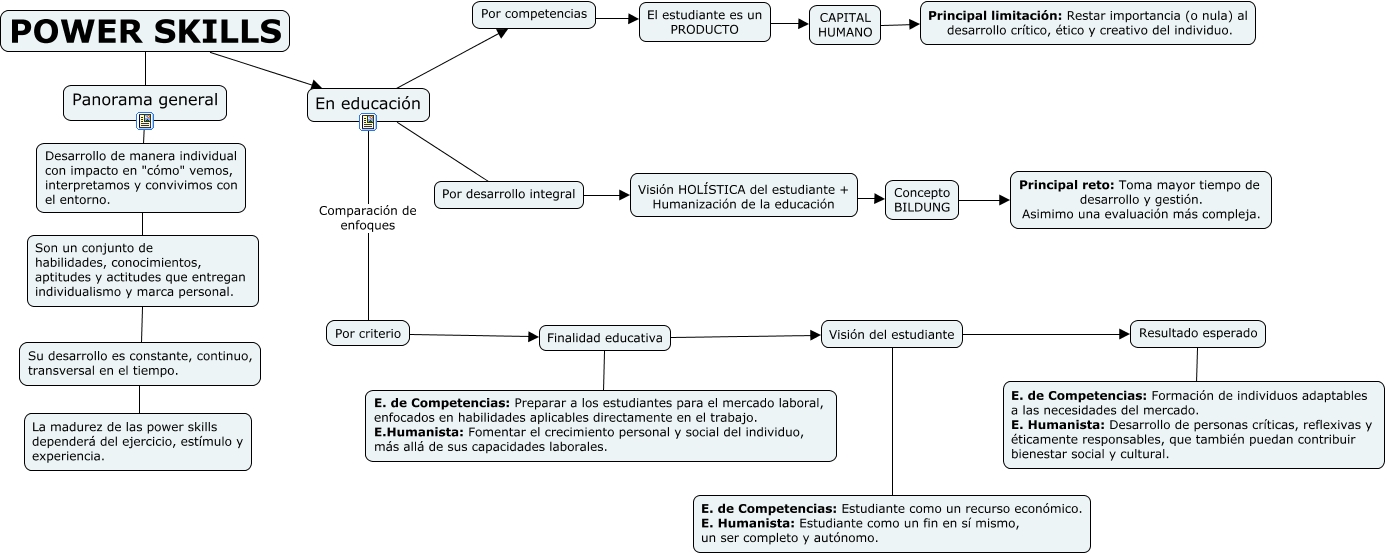 Este Cmap, tiene información relacionada con: POWER SKILLS, Son un conjunto de habilidades, conocimientos, aptitudes y actitudes que entregan individualismo y marca personal. Su desarrollo es constante, continuo, transversal en el tiempo., El estudiante es un PRODUCTO CAPITAL HUMANO, Desarrollo de manera individual con impacto en "cómo" vemos, interpretamos y convivimos con el entorno. Son un conjunto de habilidades, conocimientos, aptitudes y actitudes que entregan individualismo y marca personal., Resultado esperado E. de Competencias: Formación de individuos adaptables a las necesidades del mercado. E. Humanista: Desarrollo de personas críticas, reflexivas y éticamente responsables, que también puedan contribuir bienestar social y cultural., En educación Por desarrollo integral, CAPITAL HUMANO Principal limitación: Restar importancia (o nula) al desarrollo crítico, ético y creativo del individuo., Visión del estudiante E. de Competencias: Estudiante como un recurso económico. E. Humanista: Estudiante como un fin en sí mismo, un ser completo y autónomo., Por criterio Finalidad educativa, Visión del estudiante Resultado esperado, Por competencias El estudiante es un PRODUCTO, En educación Por competencias, POWER SKILLS En educación, Finalidad educativa Visión del estudiante, Visión HOLÍSTICA del estudiante + Humanización de la educación Concepto BILDUNG, Concepto BILDUNG Principal reto: Toma mayor tiempo de desarrollo y gestión. Asimimo una evaluación más compleja., Su desarrollo es constante, continuo, transversal en el tiempo. La madurez de las power skills dependerá del ejercicio, estímulo y experiencia., Finalidad educativa E. de Competencias: Preparar a los estudiantes para el mercado laboral, enfocados en habilidades aplicables directamente en el trabajo. E.Humanista: Fomentar el crecimiento personal y social del individuo, más allá de sus capacidades laborales., Por desarrollo integral Visión HOLÍSTICA del estudiante + Humanización de la educación, POWER SKILLS Panorama general, Panorama general Desarrollo de manera individual con impacto en "cómo" vemos, interpretamos y convivimos con el entorno.