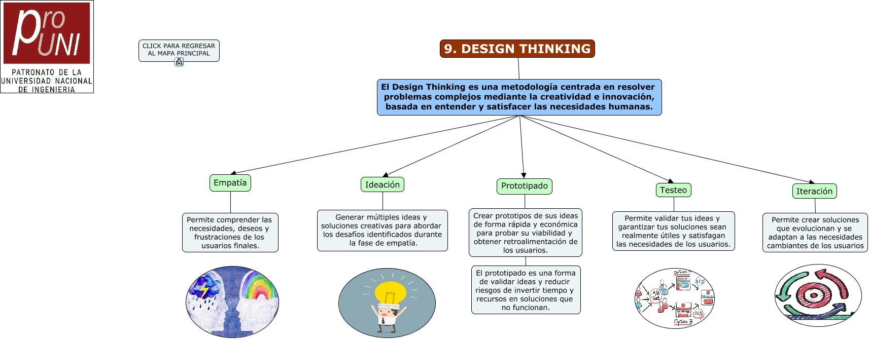 Este Cmap, tiene información relacionada con: 9. Design Thinking, El Design Thinking es una metodología centrada en resolver problemas complejos mediante la creatividad e innovación, basada en entender y satisfacer las necesidades humanas. Iteración, El Design Thinking es una metodología centrada en resolver problemas complejos mediante la creatividad e innovación, basada en entender y satisfacer las necesidades humanas. Ideación, El Design Thinking es una metodología centrada en resolver problemas complejos mediante la creatividad e innovación, basada en entender y satisfacer las necesidades humanas. Empatía, Iteración Permite crear soluciones que evolucionan y se adaptan a las necesidades cambiantes de los usuarios, El Design Thinking es una metodología centrada en resolver problemas complejos mediante la creatividad e innovación, basada en entender y satisfacer las necesidades humanas. Testeo, El Design Thinking es una metodología centrada en resolver problemas complejos mediante la creatividad e innovación, basada en entender y satisfacer las necesidades humanas. Prototipado, Prototipado El prototipado es una forma de validar ideas y reducir riesgos de invertir tiempo y recursos en soluciones que no funcionan., Testeo Permite validar tus ideas y garantizar tus soluciones sean realmente útiles y satisfagan las necesidades de los usuarios., 9. DESIGN THINKING El Design Thinking es una metodología centrada en resolver problemas complejos mediante la creatividad e innovación, basada en entender y satisfacer las necesidades humanas., Empatía Permite comprender las necesidades, deseos y frustraciones de los usuarios finales., Ideación Generar múltiples ideas y soluciones creativas para abordar los desafíos identificados durante la fase de empatía.
