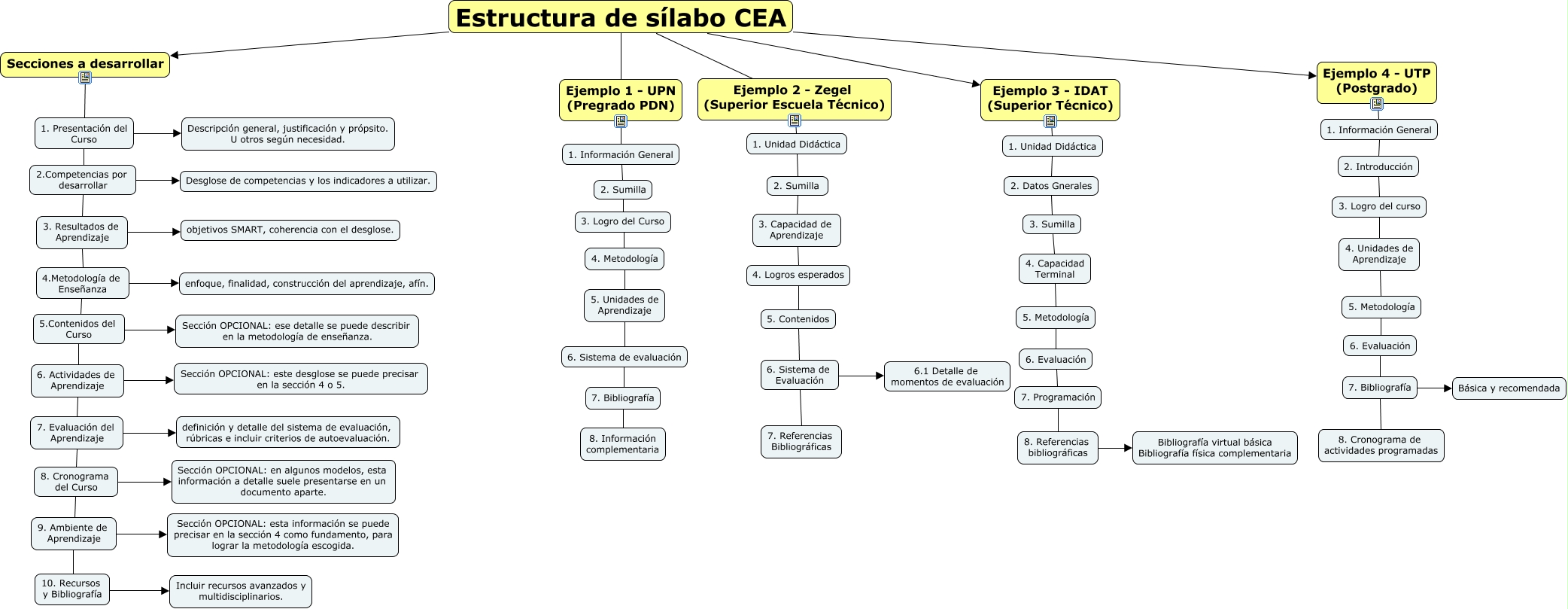 Este Cmap, tiene información relacionada con: Estrucura de Sílabo, 6. Actividades de Aprendizaje Sección OPCIONAL: este desglose se puede precisar en la sección 4 o 5., 5.Contenidos del Curso Sección OPCIONAL: ese detalle se puede describir en la metodología de enseñanza., Ejemplo 1 - UPN (Pregrado PDN) 1. Información General, 3. Resultados de Aprendizaje objetivos SMART, coherencia con el desglose., 2. Datos Gnerales 3. Sumilla, 7. Bibliografía Básica y recomendada, Ejemplo 3 - IDAT (Superior Técnico) 1. Unidad Didáctica, 4. Unidades de Aprendizaje 5. Metodología, 5.Contenidos del Curso 6. Actividades de Aprendizaje, 9. Ambiente de Aprendizaje Sección OPCIONAL: esta información se puede precisar en la sección 4 como fundamento, para lograr la metodología escogida., 5. Contenidos 6. Sistema de Evaluación, 6. Evaluación 7. Programación, 9. Ambiente de Aprendizaje 10. Recursos y Bibliografía, 8. Cronograma del Curso Sección OPCIONAL: en algunos modelos, esta información a detalle suele presentarse en un documento aparte., 7. Bibliografía 8. Cronograma de actividades programadas, 5. Metodología 6. Evaluación, 1. Unidad Didáctica 2. Sumilla, 7. Programación 8. Referencias bibliográficas, 6. Sistema de Evaluación 7. Referencias Bibliográficas, 4. Metodología 5. Unidades de Aprendizaje