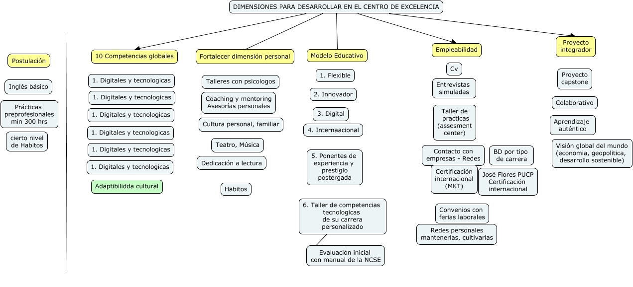 Este Cmap, tiene información relacionada con: DIMENSIONES PARA DESARROLLAR EN EL CENTRO DE EXCELENCIA,, 6. Taller de competencias tecnologicas de su carrera personalizado Evaluación inicial con manual de la NCSE, DIMENSIONES PARA DESARROLLAR EN EL CENTRO DE EXCELENCIA Modelo Educativo, DIMENSIONES PARA DESARROLLAR EN EL CENTRO DE EXCELENCIA Empleabilidad, DIMENSIONES PARA DESARROLLAR EN EL CENTRO DE EXCELENCIA Fortalecer dimensión personal, DIMENSIONES PARA DESARROLLAR EN EL CENTRO DE EXCELENCIA 10 Competencias globales, DIMENSIONES PARA DESARROLLAR EN EL CENTRO DE EXCELENCIA Proyecto integrador