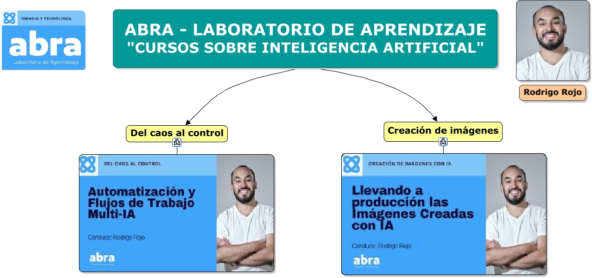 Este Cmap, tiene información relacionada con: MÁSTER DE VIDEOS IA - RODRIGO ROJO, Creación de imágenes, ABRA - LABORATORIO DE APRENDIZAJE "CURSOS SOBRE INTELIGENCIA ARTIFICIAL" Del caos al control, ABRA - LABORATORIO DE APRENDIZAJE "CURSOS SOBRE INTELIGENCIA ARTIFICIAL" Creación de imágenes, Del caos al control