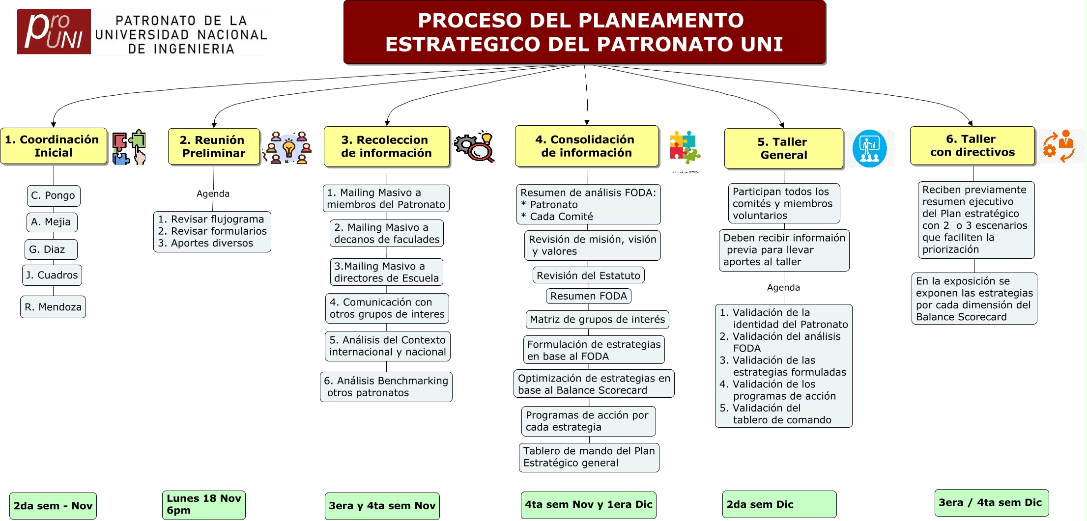 Este Cmap, tiene información relacionada con: PROCESO DEL PLANEAMENTO ESTRATEGICO DEL PATRONATO UNI, 1. Coordinación Inicial R. Mendoza, PROCESO DEL PLANEAMENTO ESTRATEGICO DEL PATRONATO UNI 4. Consolidación de información, 6. Taller con directivos En la exposición se exponen las estrategias por cada dimensión del Balance Scorecard, PROCESO DEL PLANEAMENTO ESTRATEGICO DEL PATRONATO UNI 1. Coordinación Inicial, 2. Reunión Preliminar Agenda 1. Revisar flujograma 2. Revisar formularios 3. Aportes diversos, 3. Recoleccion de información 6. Análisis Benchmarking otros patronatos, Deben recibir informaión previa para llevar aportes al taller Agenda 1. Validación de la identidad del Patronato 2. Validación del análisis FODA 3. Validación de las estrategias formuladas 4. Validación de los programas de acción 5. Validación del tablero de comando, 5. Taller General Deben recibir informaión previa para llevar aportes al taller, 4. Consolidación de información Tablero de mando del Plan Estratégico general, PROCESO DEL PLANEAMENTO ESTRATEGICO DEL PATRONATO UNI 2. Reunión Preliminar, PROCESO DEL PLANEAMENTO ESTRATEGICO DEL PATRONATO UNI 5. Taller General, PROCESO DEL PLANEAMENTO ESTRATEGICO DEL PATRONATO UNI 6. Taller con directivos, PROCESO DEL PLANEAMENTO ESTRATEGICO DEL PATRONATO UNI 3. Recoleccion de información