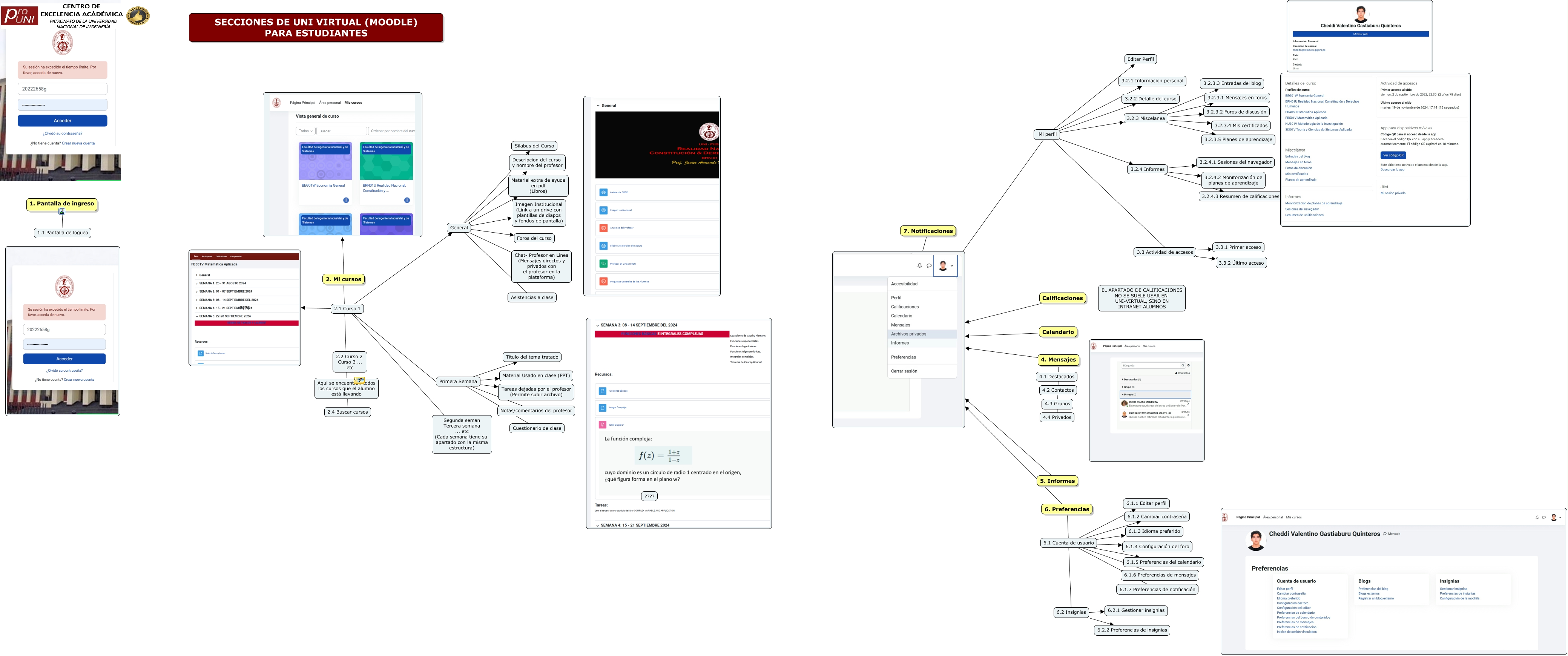 Este Cmap, tiene información relacionada con: SECCIONES DE UNI VIRTUAL (MOODLE) PARA ESTUDIANTES, 2. Mi cursos 2.4 Buscar cursos, General Imagen Institucional (Link a un drive con plantillas de diapos y fondos de pantalla), 1. Pantalla de ingreso 1.1 Pantalla de logueo, 3.3 Actividad de accesos 3.3.1 Primer acceso, 3.3 Actividad de accesos 3.3.2 Último acceso, 6. Preferencias, General Silabus del Curso, Primera Semana Notas/comentarios del profesor, General Material extra de ayuda en pdf (Libros), Mi perfil 3.2.3 Miscelanea, 2.1 Curso 1 Primera Semana, 6.1 Cuenta de usuario 6.1.7 Preferencias de notificación, 3.2.3 Miscelanea 3.2.3.4 Mis certificados, Mi perfil 3.2.2 Detalle del curso, Primera Semana Tareas dejadas por el profesor (Permite subir archivo), 2.1 Curso 1 General, General Chat- Profesor en Linea (Mensajes directos y privados con el profesor en la plataforma), 3.2.4 Informes 3.2.4.3 Resumen de calificaciones, General Asistencias a clase, 6.1 Cuenta de usuario 6.1.2 Cambiar contraseña