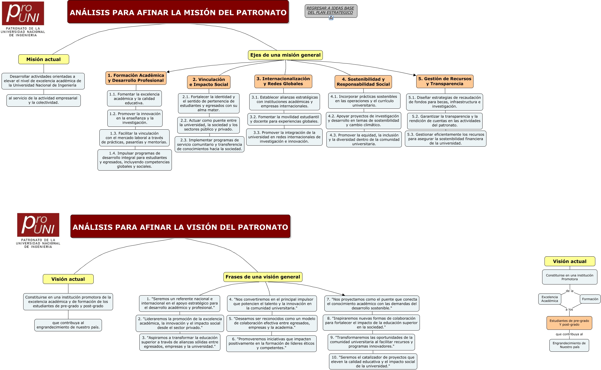 Este Cmap, tiene información relacionada con: MISIÓN Y VISIÓN DEL PATRONATO, Frases de una visión general 7. "Nos proyectamos como el puente que conecta el conocimiento académico con las demandas del desarrollo sostenible.", Ejes de una misión general 5. Gestión de Recursos y Transparencia, Constituirse en una institución Promotora de la Formación, 5. Gestión de Recursos y Transparencia 5.3. Gestionar eficientemente los recursos para asegurar la sostenibilidad financiera de la universidad., Misión actual al servicio de la actividad empresarial y la colectividad., Excelencia Académica a los Estudiantes de pre-grado Y post-grado, Visión actual Constituirse en una institución Promotora, Constituirse en una institución Promotora de la Excelencia Académica, Formación a los Estudiantes de pre-grado Y post-grado, 4. Sostenibilidad y Responsabilidad Social 4.3. Promover la equidad, la inclusión y la diversidad dentro de la comunidad universitaria., Constituirse en una institución promotora de la excelencia académica y de formación de los estudiantes de pre-grado y post-grado que contribuya al engrandecimiento de nuestro país., Ejes de una misión general 2. Vinculación e Impacto Social, 2. Vinculación e Impacto Social 2.3. Implementar programas de servicio comunitario y transferencia de conocimientos hacia la sociedad., 3. Internacionalización y Redes Globales 3.3. Promover la integración de la universidad en redes internacionales de investigación e innovación., Ejes de una misión general 4. Sostenibilidad y Responsabilidad Social, ANÁLISIS PARA AFINAR LA MISIÓN DEL PATRONATO Misión actual, 4. "Nos convertiremos en el principal impulsor que potencien el talento y la innovación en la comunidad universitaria." 6. "Promoveremos iniciativas que impacten positivamente en la formación de líderes éticos y competentes.", Frases de una visión general 4. "Nos convertiremos en el principal impulsor que potencien el talento y la innovación en la comunidad universitaria.", ANÁLISIS PARA AFINAR LA VISIÓN DEL PATRONATO Frases de una visión general, ANÁLISIS PARA AFINAR LA VISIÓN DEL PATRONATO Visión actual