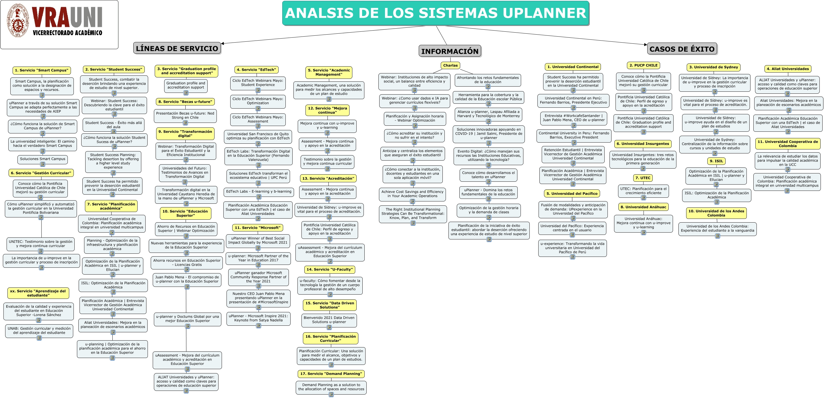 This Concept Map, created with IHMC CmapTools, has information related to: SISTEMAS UPLANNER, 4. Aliat Universidades Planificación Académica Educación Superior con una EdTech | el caso de Aliat Universidades, 15. Servicio "Data Driven Solutions" Bienvenido 2021 Data Driven Solutions u-planner, Webinar: Instituciones de alto impacto social, un balance entre eficiencia y calidad The Right Institutional Planning Strategies Can Be Transformational: Know, Plan, and Transform, ANALSIS DE LOS SISTEMAS UPLANNER CASOS DE ÉXITO, 7. UTEC UTEC: Planificación para el crecimiento eficiente, 2. PUCP CHILE Pontificia Universidad Católica de Chile: Graduation profile and accreditation support, 1. Servicio "Smart Campus" Soluciones Smart Campus, 1. Universidad Continental Planificación Académica | Entrevista Vicerrector de Gestión Académica Universidad Continental, 9. Servicio "Transformación digital" Transformación digital en la Universidad Cayetano Heredia de la mano de uPlanner y Microsoft, 13. Servicio "Acreditación" uAssessment - Mejora del currículum académico y acreditación en Educación Superior, 10. Universidad de los Andes Colombia Universidad de los Andes Colombia: Experiencia del estudiante a la vanguardia, 11. Universidad Cooperativa de Colombia Universidad Cooperativa de Colombia: Planificación académica integral en universidad multicampus, 9. ISIL ISIL: Optimización de la Planificación Académica, Charlas Webinar: Instituciones de alto impacto social, un balance entre eficiencia y calidad, 17. Servicio "Demand Planning" Demand Planning as a solution to the allocation of spaces and resources, INFORMACIÓN Charlas, 7. Servicio "Planificación académica" u-planning | Optimización de la planificación académica para el ahorro en la Educación Superior, 12. Servicio "Mejora continua" Testimonio sobre la gestión y mejora continua curricular, 8. Servicio "Becas u-future" Presentación Becas u-future: Ned Strong en Chile, 10. Servicio "Educación Superior" ALIAT Universidades y uPlanner: acceso y calidad como claves para operaciones de educación superior