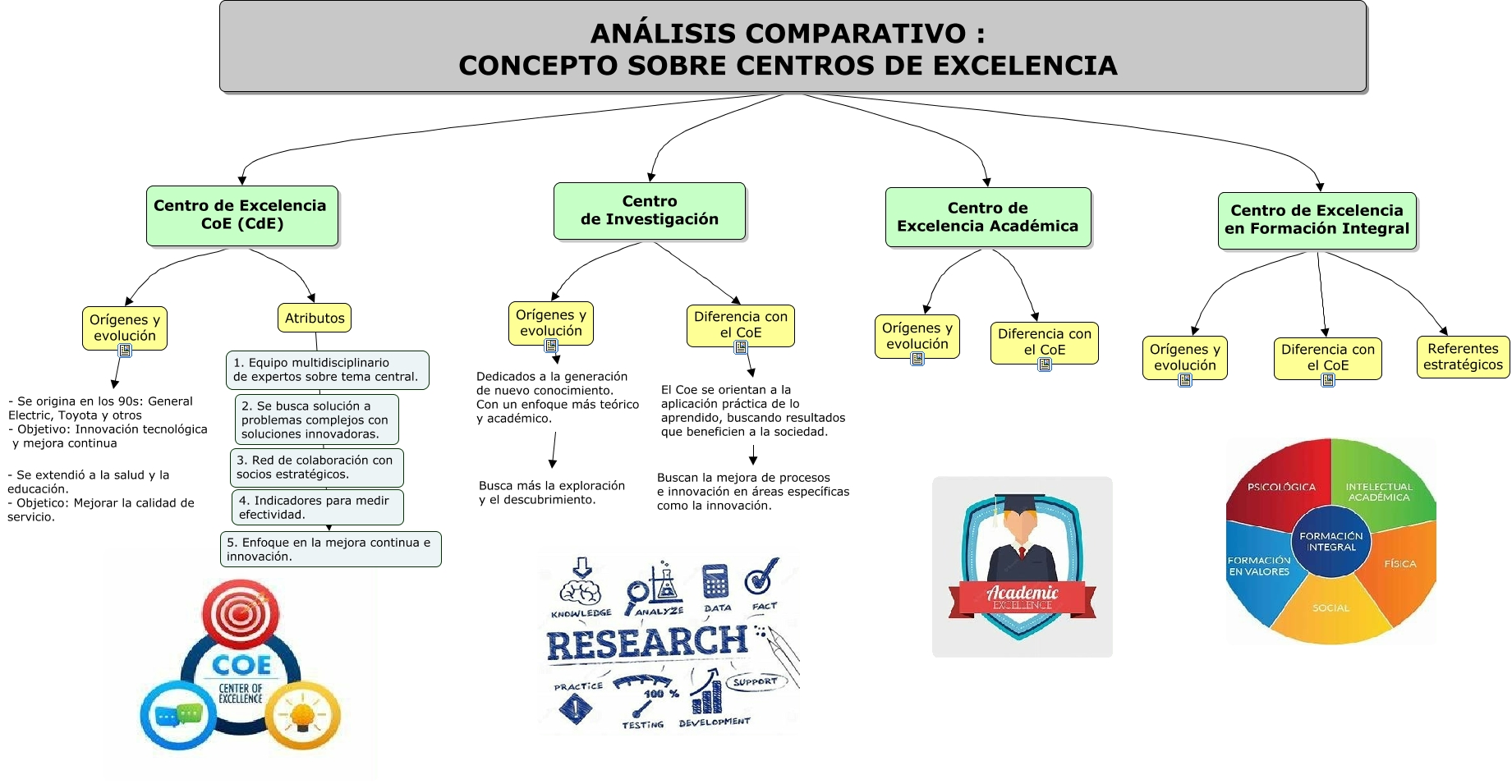 Este Cmap, tiene información relacionada con: ANÁLISIS COMPARATIVO - CONCEPTO SOBRE CENTROS DE EXCELENCIA, Centro de Excelencia CoE (CdE) Atributos, ANÁLISIS COMPARATIVO : CONCEPTO SOBRE CENTROS DE EXCELENCIA Centro de Excelencia Académica, Orígenes y evolución Dedicados a la generación de nuevo conocimiento. Con un enfoque más teórico y académico., Atributos 5. Enfoque en la mejora continua e innovación., Centro de Excelencia Académica Diferencia con el CoE, Centro de Excelencia CoE (CdE) Orígenes y evolución, ANÁLISIS COMPARATIVO : CONCEPTO SOBRE CENTROS DE EXCELENCIA Centro de Investigación, El Coe se orientan a la aplicación práctica de lo aprendido, buscando resultados que beneficien a la sociedad. Buscan la mejora de procesos e innovación en áreas específicas como la innovación., Centro de Excelencia Académica Orígenes y evolución, ANÁLISIS COMPARATIVO : CONCEPTO SOBRE CENTROS DE EXCELENCIA Centro de Excelencia CoE (CdE), Centro de Excelencia en Formación Integral Referentes estratégicos, Centro de Investigación Orígenes y evolución, Centro de Excelencia en Formación Integral Diferencia con el CoE, Centro de Excelencia en Formación Integral Orígenes y evolución, Centro de Investigación Diferencia con el CoE, ANÁLISIS COMPARATIVO : CONCEPTO SOBRE CENTROS DE EXCELENCIA Centro de Excelencia en Formación Integral, Dedicados a la generación de nuevo conocimiento. Con un enfoque más teórico y académico. Busca más la exploración y el descubrimiento., Diferencia con el CoE El Coe se orientan a la aplicación práctica de lo aprendido, buscando resultados que beneficien a la sociedad., Orígenes y evolución - Se origina en los 90s: General Electric, Toyota y otros - Objetivo: Innovación tecnológica y mejora continua