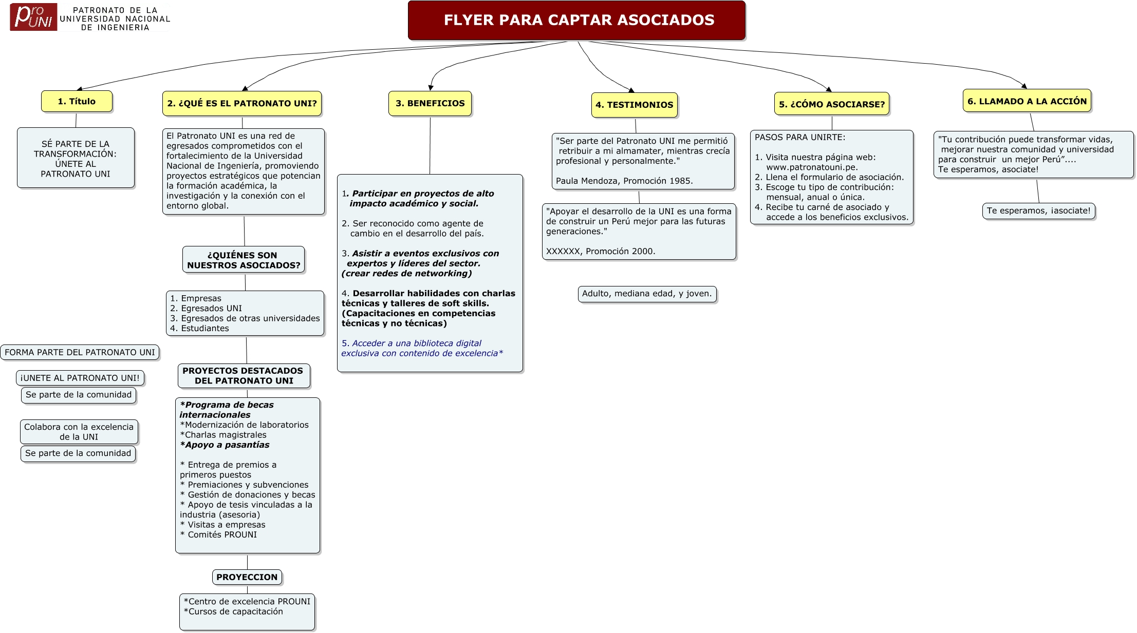 Este Cmap, tiene información relacionada con: FLYER PARA CAPTAR ASOCIADOS, 2. ¿QUÉ ES EL PATRONATO UNI? *Programa de becas internacionales *Modernización de laboratorios *Charlas magistrales *Apoyo a pasantías * Entrega de premios a primeros puestos * Premiaciones y subvenciones * Gestión de donaciones y becas * Apoyo de tesis vinculadas a la industria (asesoria) * Visitas a empresas * Comités PROUNI, 3. BENEFICIOS 1. Participar en proyectos de alto impacto académico y social. 2. Ser reconocido como agente de cambio en el desarrollo del país. 3. Asistir a eventos exclusivos con expertos y líderes del sector. (crear redes de networking) 4. Desarrollar habilidades con charlas técnicas y talleres de soft skills. (Capacitaciones en competencias técnicas y no técnicas) 5. Acceder a una biblioteca digital exclusiva con contenido de excelencia*, *Programa de becas internacionales *Modernización de laboratorios *Charlas magistrales *Apoyo a pasantías * Entrega de premios a primeros puestos * Premiaciones y subvenciones * Gestión de donaciones y becas * Apoyo de tesis vinculadas a la industria (asesoria) * Visitas a empresas * Comités PROUNI PROYECCION, 6. LLAMADO A LA ACCIÓN "Tu contribución puede transformar vidas, mejorar nuestra comunidad y universidad para construir un mejor Perú”.... Te esperamos, asociate!, FLYER PARA CAPTAR ASOCIADOS 2. ¿QUÉ ES EL PATRONATO UNI?, PROYECCION *Centro de excelencia PROUNI *Cursos de capacitación, FLYER PARA CAPTAR ASOCIADOS 5. ¿CÓMO ASOCIARSE?, FLYER PARA CAPTAR ASOCIADOS 6. LLAMADO A LA ACCIÓN, FLYER PARA CAPTAR ASOCIADOS 1. Título, 4. TESTIMONIOS "Apoyar el desarrollo de la UNI es una forma de construir un Perú mejor para las futuras generaciones." XXXXXX, Promoción 2000., 5. ¿CÓMO ASOCIARSE? PASOS PARA UNIRTE: 1. Visita nuestra página web: www.patronatouni.pe. 2. Llena el formulario de asociación. 3. Escoge tu tipo de contribución: mensual, anual o única. 4. Recibe tu carné de asociado y accede a los beneficios exclusivos., FLYER PARA CAPTAR ASOCIADOS 3. BENEFICIOS, 1. Título SÉ PARTE DE LA TRANSFORMACIÓN: ÚNETE AL PATRONATO UNI, FLYER PARA CAPTAR ASOCIADOS 4. TESTIMONIOS, "Tu contribución puede transformar vidas, mejorar nuestra comunidad y universidad para construir un mejor Perú”.... Te esperamos, asociate! Te esperamos, ¡asociate!